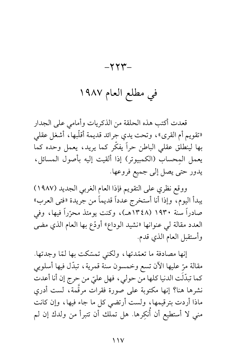 ووقع نظري على التقويم فإذا العام الغربي الجديد (1987) يبدأ اليوم، وإذا أنا أستخرج عدداً قديماً من جريدة «فتى العرب» صادراً سنة 1930 (1348هـ)، وكنت يومئذ محرّراً فيها، وفي العدد مقالة لي عنوانها «نشيد الوداع» أودّع بها العام الذي مضى وأستقبل العام الذي قدم.