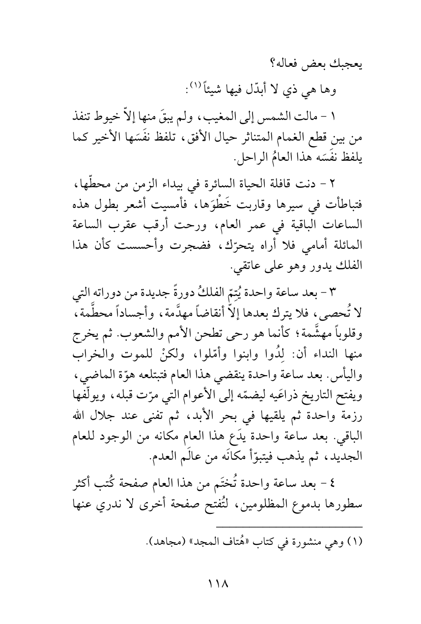 3 - بعد ساعة واحدة يُتِمّ الفلكُ دورةً جديدة من دوراته التي لا تُحصى، فلا يترك بعدها إلاّ أنقاضاً مهدَّمة، وأجساداً محطَّمة، وقلوباً مهشَّمة؛ كأنما هو رحى تطحن الأمم والشعوب. ثم يخرج منها النداء أن: لِدُوا وابنوا وأمّلوا، ولكنْ للموت والخراب واليأس. بعد ساعة واحدة ينقضي هذا العام فتبتلعه هوّة الماضي، ويفتح التاريخ ذراعَيه ليضمّه إلى الأعوام التي مرّت قبله، ويولّفها رزمة واحدة ثم يلقيها في بحر الأبد، ثم تفنى عند جلال الله الباقي. بعد ساعة واحدة يدَع هذا العام مكانه من الوجود للعام الجديد، ثم يذهب فيتبوّأ مكانَه من عالَم العدم.