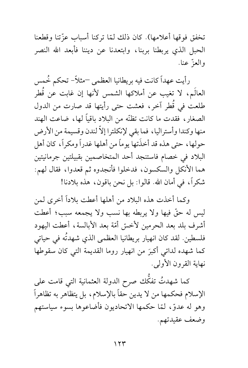 وكما أخذت هذه البلاد من أهلها أعطت بلاداً أخرى لمن ليس له حقّ فيها ولا يربطه بها نسب ولا يجمعه سبب؛ أعطت أشرف بلد بعد الحرمين لأخسّ أمّة بعد الأبالسة، أعطت اليهود فلسطين. لقد كان انهيار بريطانيا العظمى الذي شهدتُه في حياتي كما شهده لداتي أكبرَ من انهيار روما القديمة التي كان سقوطها نهاية القرون الأولى.