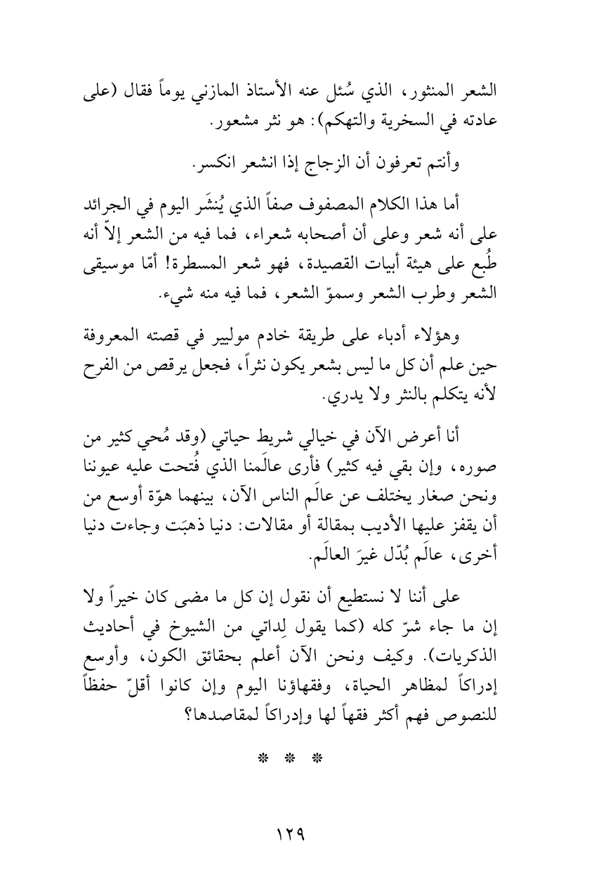 أما هذا الكلام المصفوف صفاً الذي يُنشَر اليوم في الجرائد على أنه شعر وعلى أن أصحابه شعراء، فما فيه من الشعر إلاّ أنه طُبع على هيئة أبيات القصيدة، فهو شعر المسطرة! أمّا موسيقى الشعر وطرب الشعر وسموّ الشعر، فما فيه منه شيء.