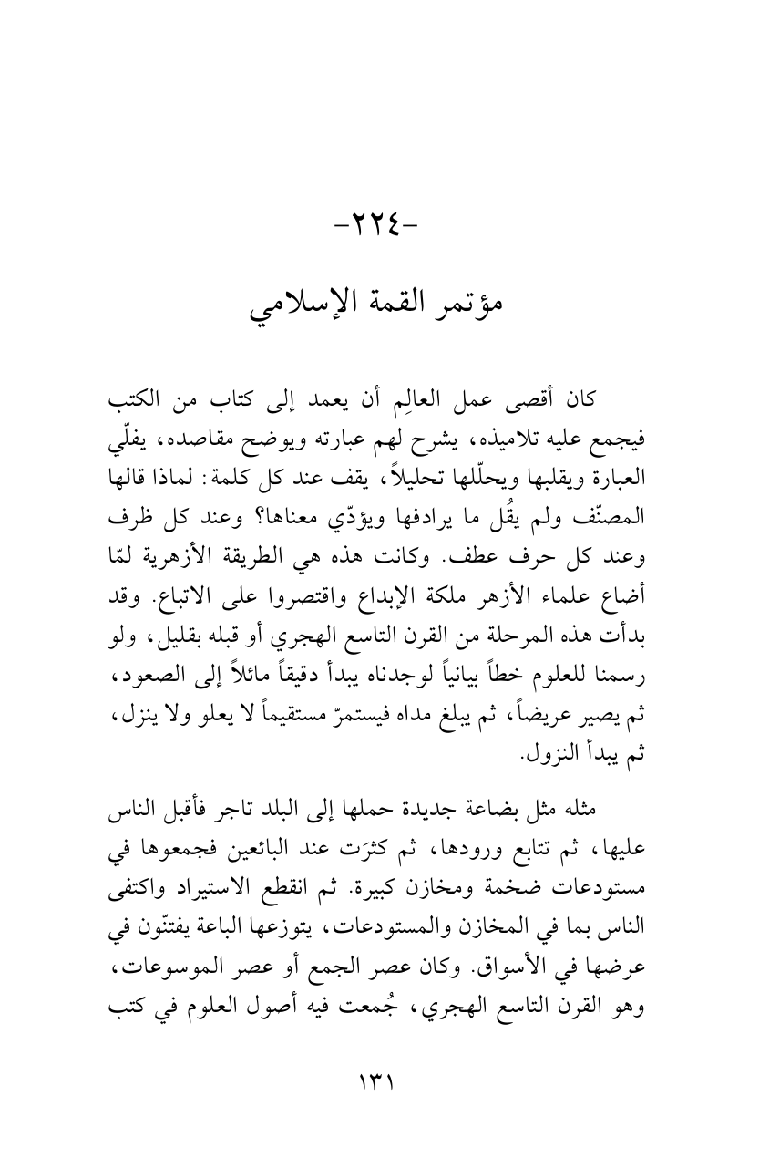 كان أقصى عمل العالِم أن يعمد إلى كتاب من الكتب فيجمع عليه تلاميذه، يشرح لهم عبارته ويوضح مقاصده، يفلّي العبارة ويقلبها ويحلّلها تحليلاً، يقف عند كل كلمة: لماذا قالها المصنّف ولم يقُل ما يرادفها ويؤدّي معناها؟ وعند كل ظرف وعند كل حرف عطف. وكانت هذه هي الطريقة الأزهرية لمّا أضاع علماء الأزهر ملكة الإبداع واقتصروا على الاتباع. وقد بدأت هذه المرحلة من القرن التاسع الهجري أو قبله بقليل، ولو رسمنا للعلوم خطاً بيانياً لوجدناه يبدأ دقيقاً مائلاً إلى الصعود، ثم يصير عريضاً، ثم يبلغ مداه فيستمرّ مستقيماً لا يعلو ولا ينزل، ثم يبدأ النزول.