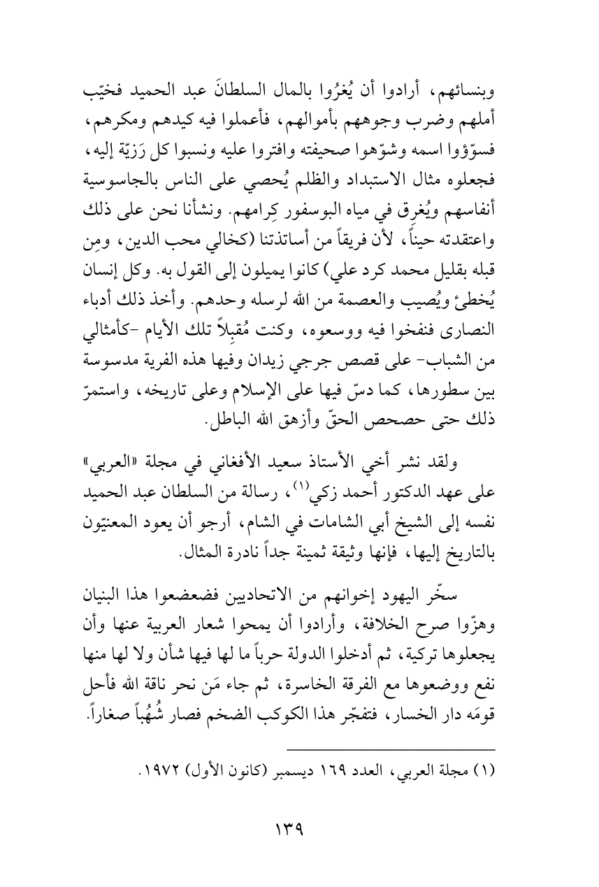 وبنسائهم، أرادوا أن يُغرُوا بالمال السلطانَ عبد الحميد فخيّب أملهم وضرب وجوههم بأموالهم، فأعملوا فيه كيدهم ومكرهم، فسوّؤوا اسمه وشوّهوا صحيفته وافتروا عليه ونسبوا كل رَزيّة إليه، فجعلوه مثال الاستبداد والظلم يُحصي على الناس بالجاسوسية أنفاسهم ويُغرِق في مياه البوسفور كِرامهم. ونشأنا نحن على ذلك واعتقدته حيناً، لأن فريقاً من أساتذتنا (كخالي محب الدين، ومِن قبله بقليل محمد كرد علي) كانوا يميلون إلى القول به. وكل إنسان يُخطئ ويُصيب والعصمة من الله لرسله وحدهم. وأخذ ذلك أدباء النصارى فنفخوا فيه ووسعوه، وكنت مُقبِلاً تلك الأيام -كأمثالي من الشباب- على قصص جرجي زيدان وفيها هذه الفرية مدسوسة بين سطورها، كما دسّ فيها على الإسلام وعلى تاريخه، واستمرّ ذلك حتى حصحص الحقّ وأزهق الله الباطل.