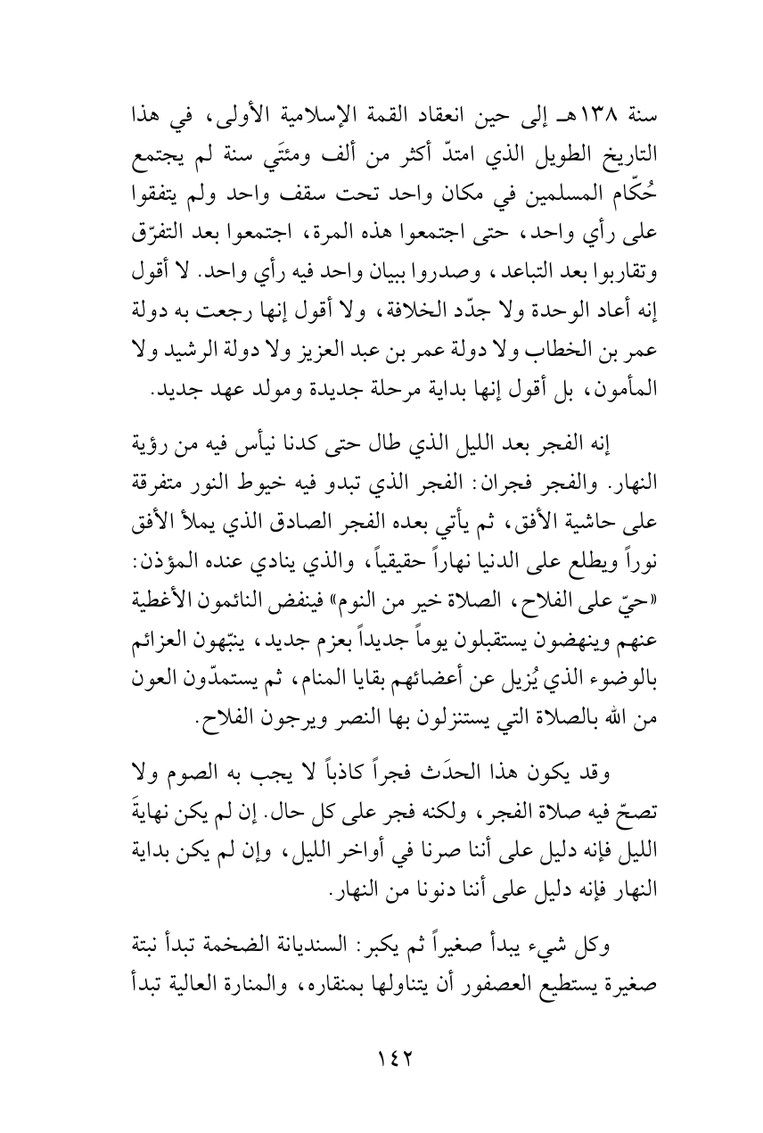 إنه الفجر بعد الليل الذي طال حتى كدنا نيأس فيه من رؤية النهار. والفجر فجران: الفجر الذي تبدو فيه خيوط النور متفرقة على حاشية الأفق، ثم يأتي بعده الفجر الصادق الذي يملأ الأفق نوراً ويطلع على الدنيا نهاراً حقيقياً، والذي ينادي عنده المؤذن: «حيّ على الفلاح، الصلاة خير من النوم» فينفض النائمون الأغطية عنهم وينهضون يستقبلون يوماً جديداً بعزم جديد، ينبّهون العزائم بالوضوء الذي يُزيل عن أعضائهم بقايا المنام، ثم يستمدّون العون من الله بالصلاة التي يستنزلون بها النصر ويرجون الفلاح.