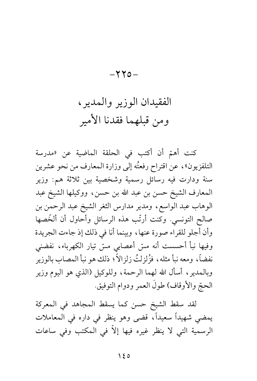 كنت أهمّ أن أكتب في الحلقة الماضية عن «مدرسة التلفزيون»، عن اقتراح رفعتُه إلى وزارة المعارف من نحو عشرين سنة ودارت فيه رسائل رسمية وشخصية بين ثلاثة هم: وزير المعارف الشيخ حسن بن عبد الله بن حسن، ووكيلها الشيخ عبد الوهاب عبدالواسع، ومدير مدارس الثغر الشيخ عبد الرحمن بن صالح التونسي. وكنت أرتّب هذه الرسائل وأحاول أن ألخّصها وأن أجلو للقراء صورة عنها، وبينما أنا في ذلك إذ جاءت الجريدة وفيها نبأ أحسست أنه مسّ أعصابي مسّ تيار الكهرباء، نفضني نفضاً، ومعه نبأ مثله، فزُلزلتُ زلزالاً؛ ذلك هو نبأ المصاب بالوزير وبالمدير، أسأل الله لهما الرحمة، وللوكيل (الذي هو اليوم وزير الحجّ والأوقاف) طولَ العمر ودوام التوفيق.