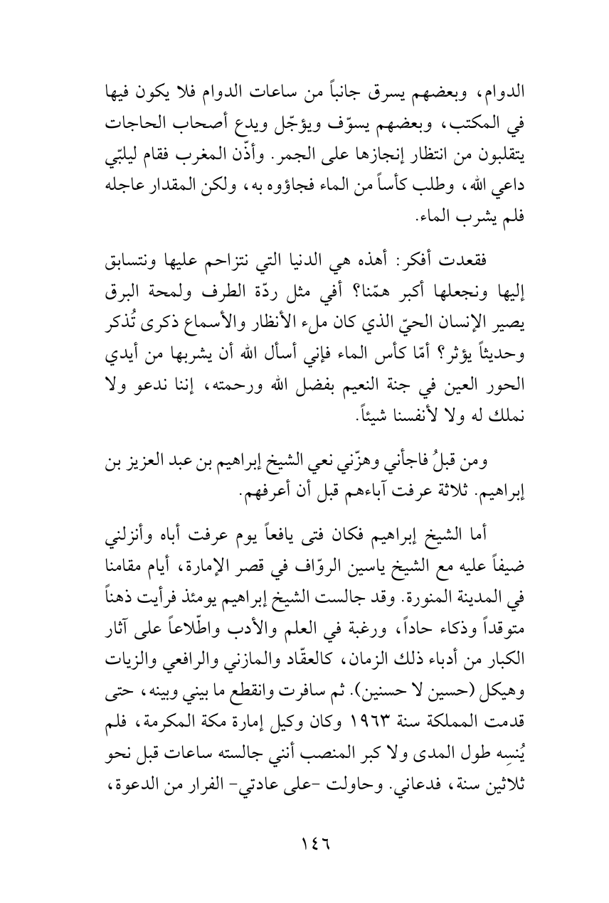 فقعدت أفكر: أهذه هي الدنيا التي نتزاحم عليها ونتسابق إليها ونجعلها أكبر همّنا؟ أفي مثل ردّة الطرف ولمحة البرق يصير الإنسان الحيّ الذي كان ملء الأنظار والأسماع ذكرى تُذكر وحديثاً يؤثر؟ أمّا كأس الماء فإني أسأل الله أن يشربها من أيدي الحور العين في جنة النعيم بفضل الله ورحمته، إننا ندعو ولا نملك له ولا لأنفسنا شيئاً.