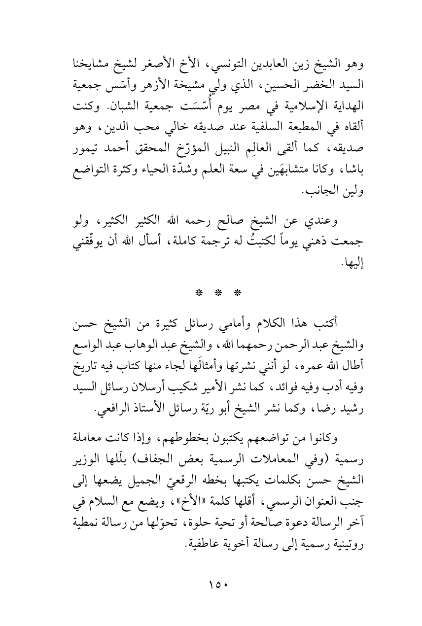 وهو الشيخ زين العابدين التونسي، الأخ الأصغر لشيخ مشايخنا السيد الخضر الحسين، الذي ولي مشيخة الأزهر وأسّس جمعية الهداية الإسلامية في مصر يوم أُسّسَت جمعية الشبان. وكنت ألقاه في المطبعة السلفية عند صديقه خالي محب الدين، وهو صديقه، كما ألقى العالِم النبيل المؤرّخ المحقق أحمد تيمور باشا، وكانا متشابهَين في سعة العلم وشدّة الحياء وكثرة التواضع ولين الجانب.