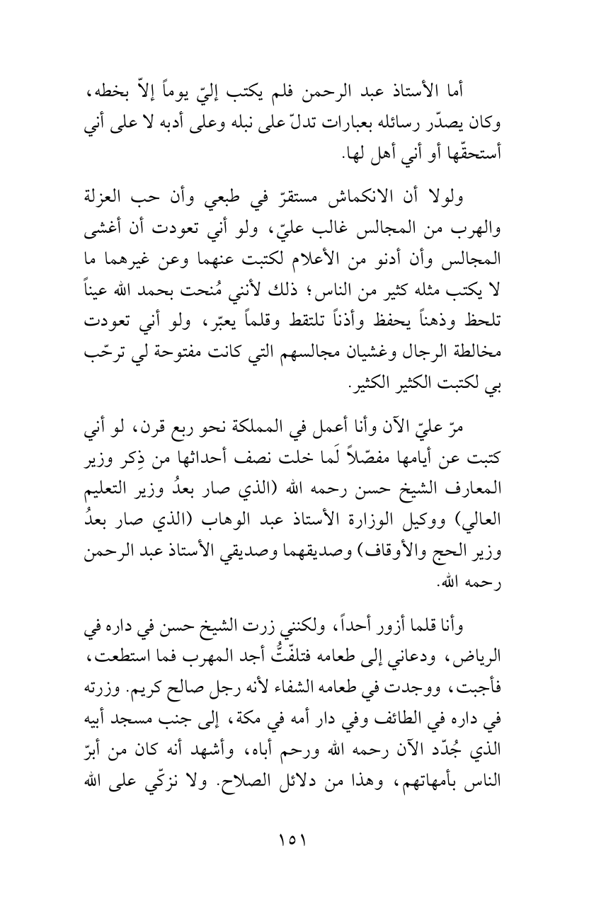 وأنا قلما أزور أحداً، ولكنني زرت الشيخ حسن في داره في الرياض، ودعاني إلى طعامه فتلفّتُّ أجد المهرب فما استطعت، فأجبت، ووجدت في طعامه الشفاء لأنه رجل صالح كريم. وزرته في داره في الطائف وفي دار أمه في مكة، إلى جنب مسجد أبيه الذي جُدّد الآن رحمه الله ورحم أباه، وأشهد أنه كان من أبرّ الناس بأمهاتهم، وهذا من دلائل الصلاح. ولا نزكّي على الله