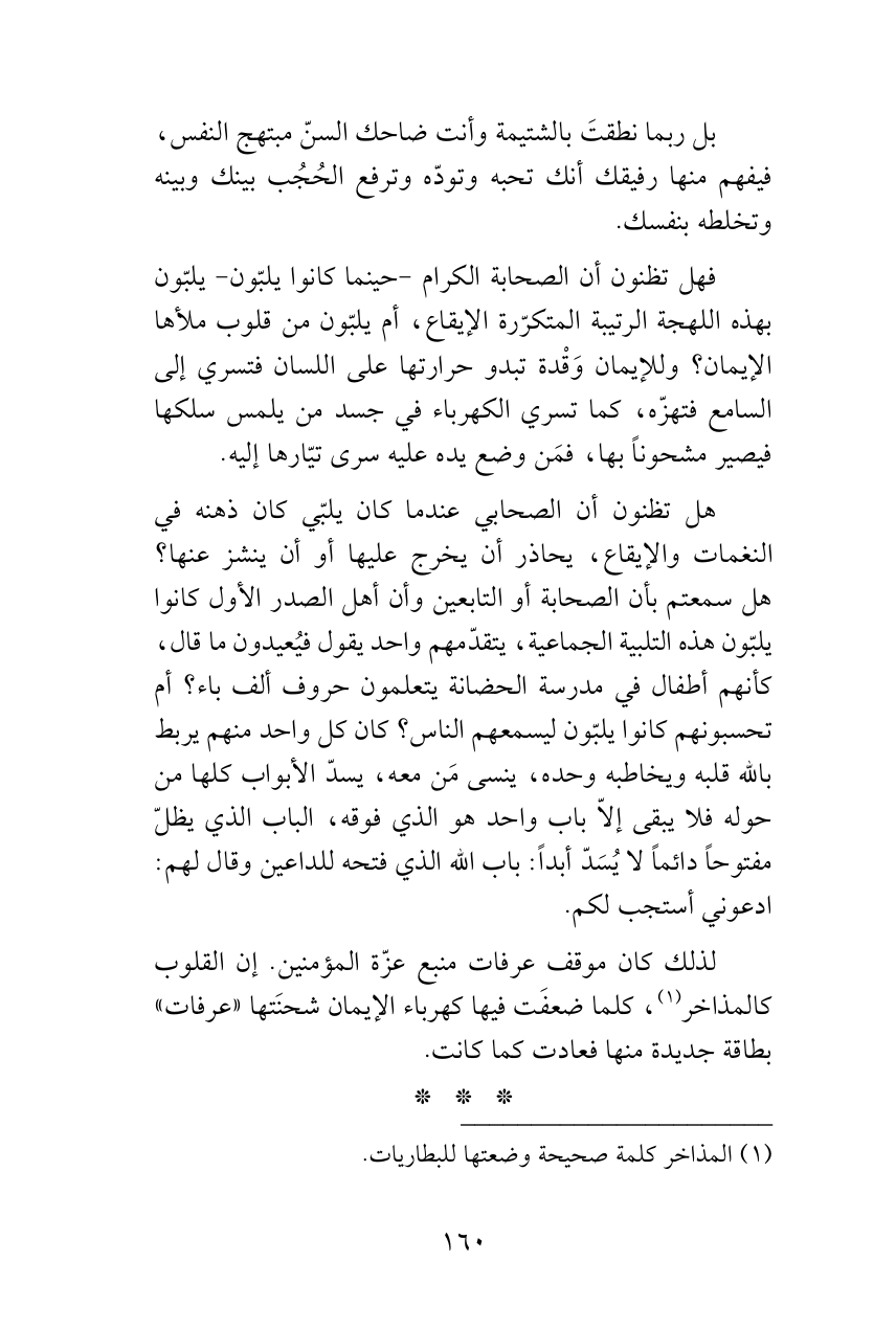 فهل تظنون أن الصحابة الكرام -حينما كانوا يلبّون- يلبّون بهذه اللهجة الرتيبة المتكرّرة الإيقاع، أم يلبّون من قلوب ملأها الإيمان؟ وللإيمان وَقْدة تبدو حرارتها على اللسان فتسري إلى السامع فتهزّه، كما تسري الكهرباء في جسد من يلمس سلكها فيصير مشحوناً بها، فمَن وضع يده عليه سرى تيّارها إليه.