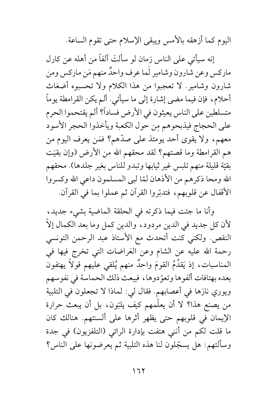 إنه سيأتي على الناس زمان لو سألتَ ألفاً من أهله عن كارل ماركس وعن شارون وشامير لَما عرف واحدٌ منهم مَن ماركس ومن شارون وشامير. لا تعجبوا من هذا الكلام ولا تحسبوه أضغاث أحلام، فإن فيما مضى إشارة إلى ما سيأتي. ألم يكن القرامطة يوماً متسلطين على الناس يعيثون في الأرض فساداً؟ ألم يقتحموا الحرم على الحجاج فيذبحوهم مِن حول الكعبة ويأخذوا الحجر الأسود معهم، ولا يقوى أحد يومئذ على صدّهم؟ فمَن يعرف اليوم من هم القرامطة وما قصتهم؟ لقد محقهم الله من الأرض (وإن بقيَت بقيّة قليلة منهم تلبس غير ثيابها وتبدو للناس بغير جلدها). محقهم الله ومحا ذكرهم من الأذهان لمّا لبى المسلمون داعي الله وكسروا الأقفال عن قلوبهم، فتدبّروا القرآن ثم عملوا بما في القرآن.