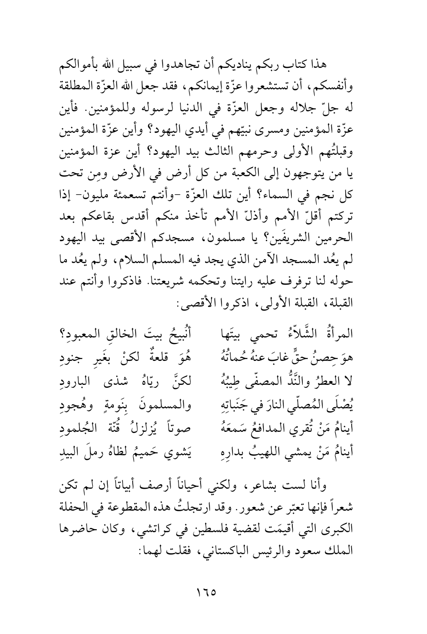 وأنا لست بشاعر، ولكني أحياناً أرصف أبياتاً إن لم تكن شعراً فإنها تعبّر عن شعور. وقد ارتجلتُ هذه المقطوعة في الحفلة الكبرى التي أقيمَت لقضية فلسطين في كراتشي، وكان حاضرها الملك سعود والرئيس الباكستاني، فقلت لهما: