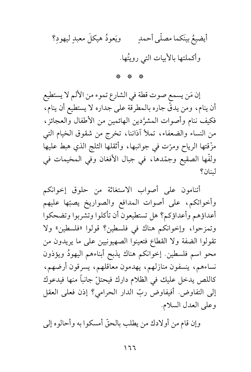 أتنامون على أصوات الاستغاثة من حلوق إخوانكم وأخواتكم، على أصوات المدافع والصواريخ يصبّها عليهم أعداؤهم وأعداؤكم؟ هل تستطيعون أن تأكلوا وتشربوا وتضحكوا وتمزحوا، وإخوانكم هناك في فلسطين (1) يذبّح أبناءهم اليهودُ ويؤذون نساءهم، ينسفون منازلهم، يهدمون معاقلهم، يسرقون أرضهم؟ كاللص يدخل عليك في الظلام دارك فيحتلّ جانباً منها فيدعوك إلى التفاوض. أفيفاوض ربّ الدار الحرامي؟ إذن فعلى العقل وعلى العدل السلام.