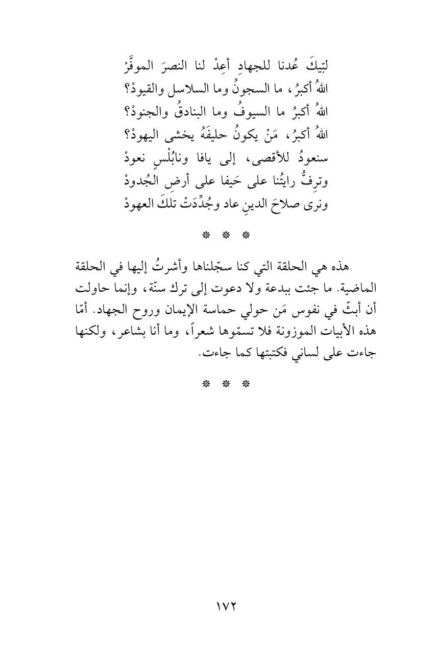 هذه هي الحلقة التي كنا سجّلناها وأشرتُ إليها في الحلقة الماضية. ما جئت ببدعة ولا دعوت إلى ترك سنّة، وإنما حاولت أن أبثّ في نفوس مَن حولي حماسة الإيمان وروح الجهاد. أمّا هذه الأبيات الموزونة فلا تسمّوها شعراً، وما أنا بشاعر، ولكنها جاءت على لساني فكتبتها كما جاءت.