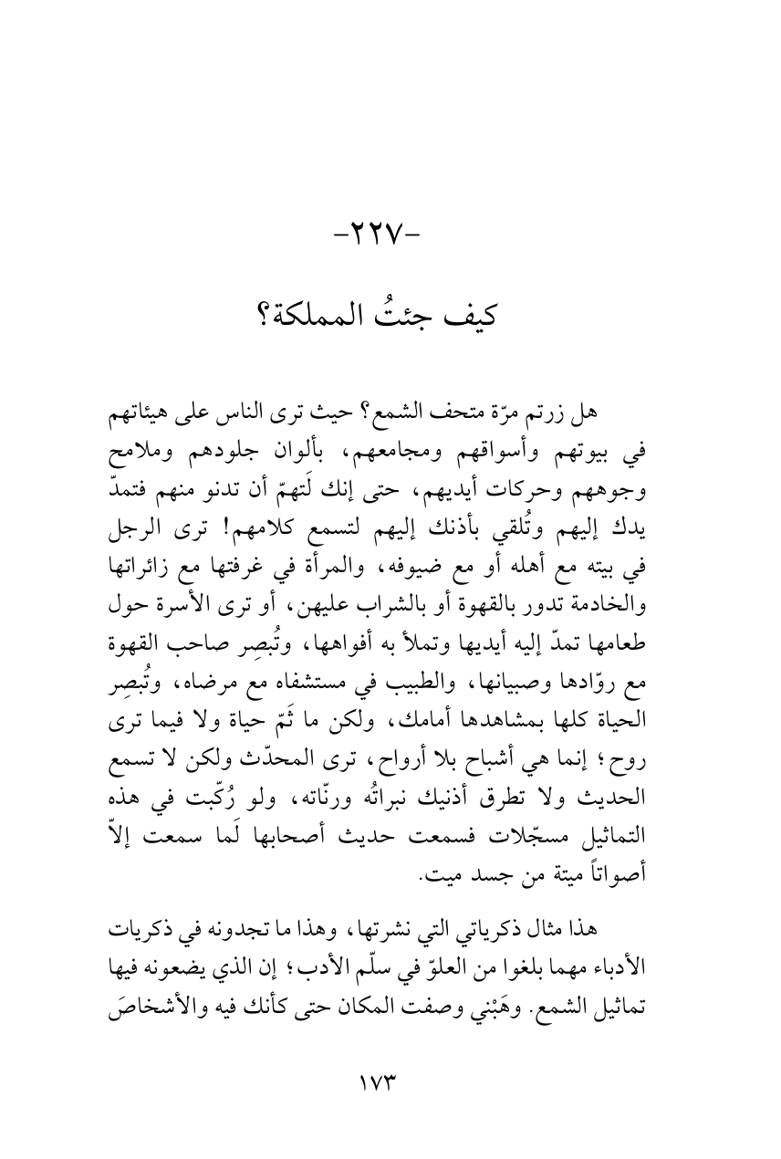 هذا مثال ذكرياتي التي نشرتها، وهذا ما تجدونه في ذكريات الأدباء مهما بلغوا من العلوّ في سلّم الأدب؛ إن الذي يضعونه فيها تماثيل الشمع. وهَبْني وصفت المكان حتى كأنك فيه والأشخاصَ