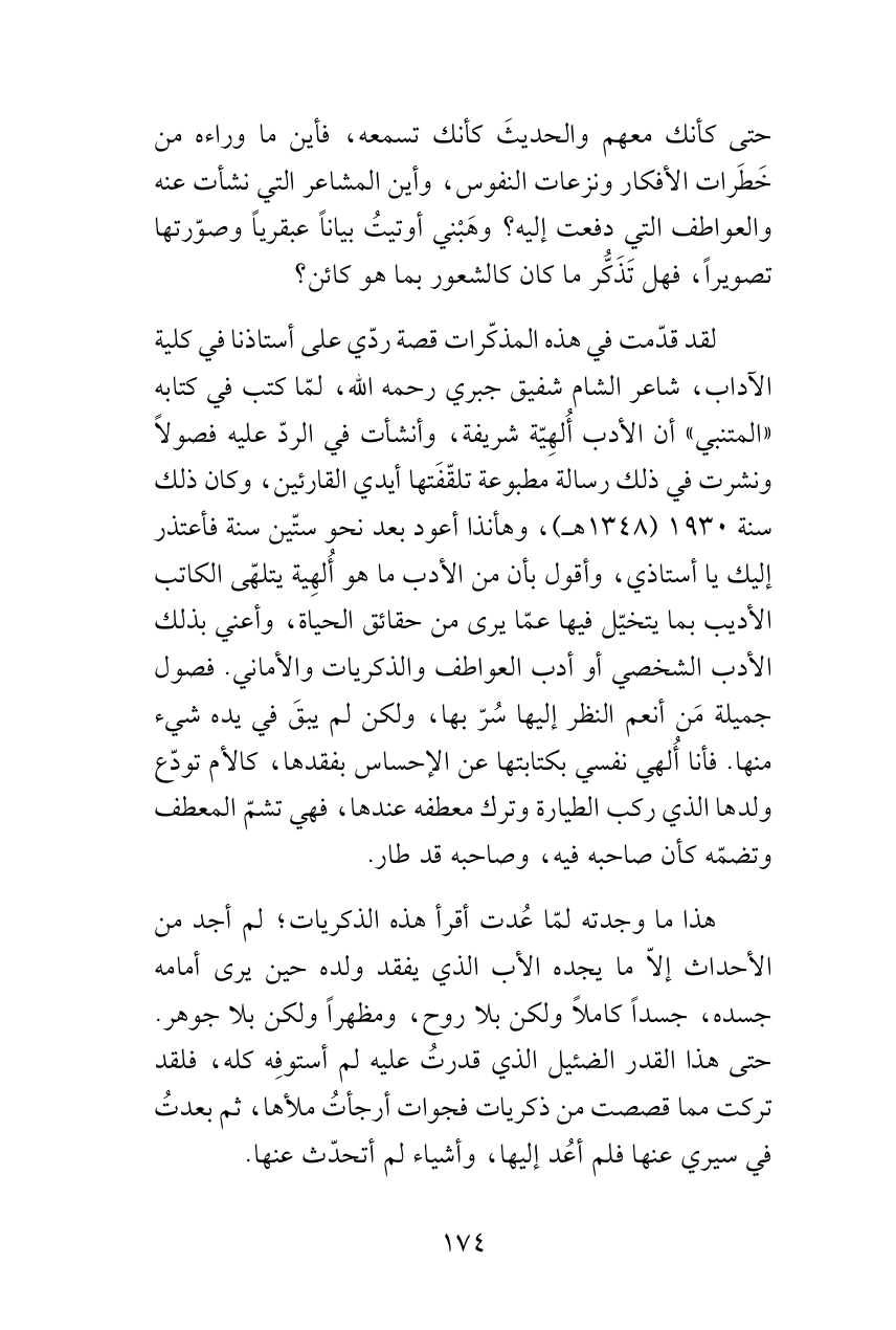 لقد قدّمت في هذه المذكّرات قصة ردّي على أستاذنا في كلية الآداب، شاعر الشام شفيق جبري رحمه الله، لمّا كتب في كتابه «المتنبي» أن الأدب أُلهِيّة شريفة، وأنشأت في الردّ عليه فصولاً ونشرت في ذلك رسالة مطبوعة تلقّفَتها أيدي القارئين، وكان ذلك سنة 1930 (1348هـ)، وهأنذا أعود بعد نحو ستّين سنة فأعتذر إليك ياأستاذي، وأقول بأن من الأدب ما هو أُلهِية يتلهّى الكاتب الأديب بما يتخيّل فيها عمّا يرى من حقائق الحياة، وأعني بذلك الأدب الشخصي أو أدب العواطف والذكريات والأماني. فصول جميلة مَن أنعم النظر إليها سُرّ بها، ولكن لم يبقَ في يده شيء منها. فأنا أُلهي نفسي بكتابتها عن الإحساس بفقدها، كالأم تودّع ولدها الذي ركب الطيارة وترك معطفه عندها، فهي تشمّ المعطف وتضمّه كأن صاحبه فيه، وصاحبه قد طار.
