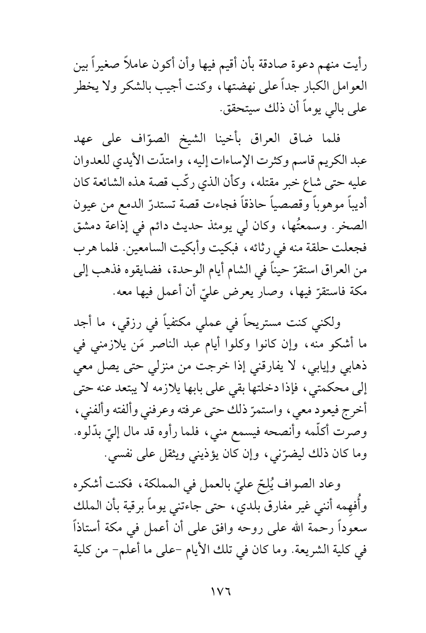 وعاد الصواف يُلِحّ عليّ بالعمل في المملكة، فكنت أشكره وأُفهِمه أنني غير مفارق بلدي، حتى جاءتني يوماً برقية بأن الملك سعوداً رحمة الله على روحه وافق على أن أعمل في مكة أستاذاً في كلية الشريعة. وما كان في تلك الأيام -على ما أعلم- من كلية