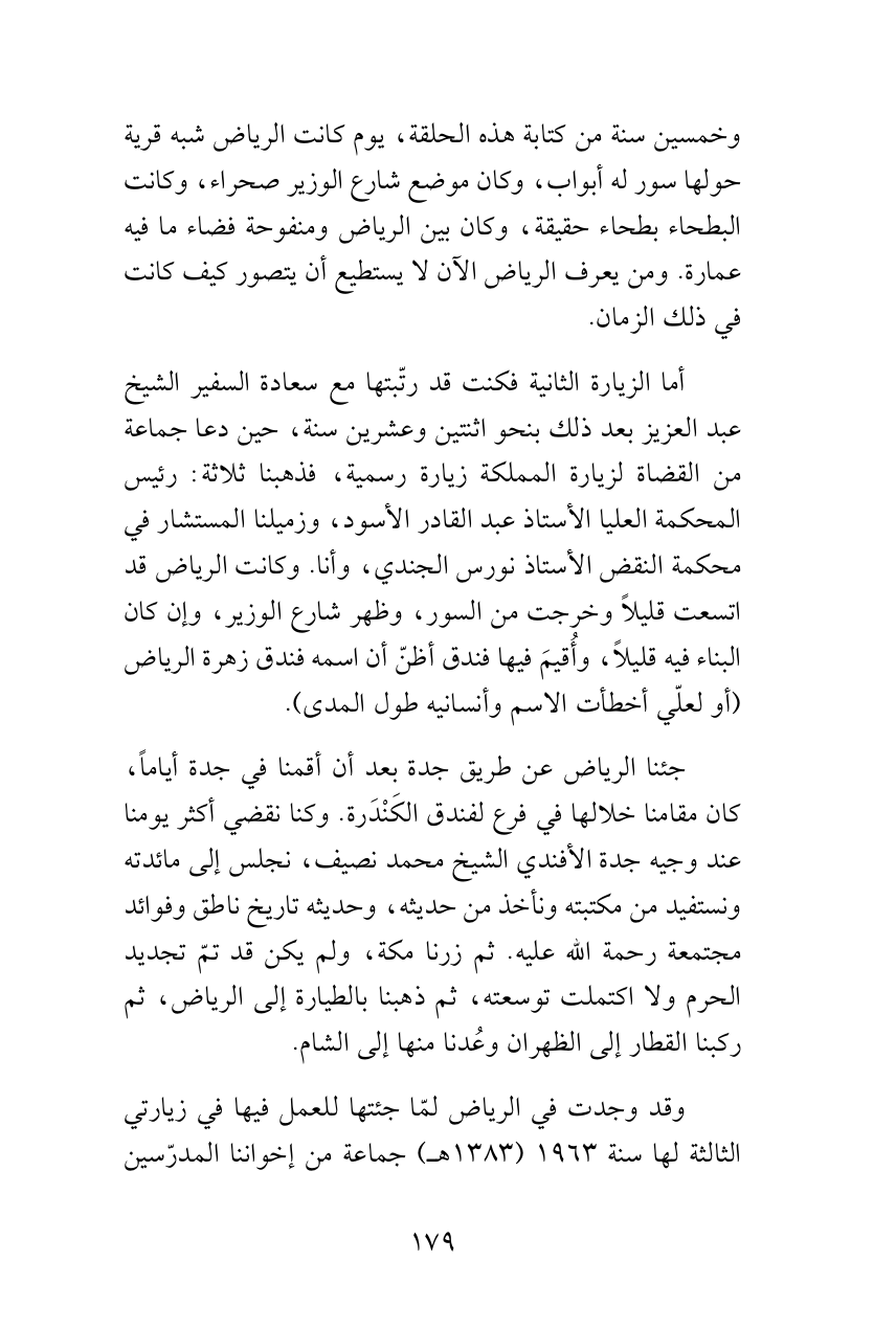 أما الزيارة الثانية فكنت قد رتّبتها مع سعادة السفير الشيخ عبد العزيز بعد ذلك بنحو اثنتين وعشرين سنة، حين دعا جماعة من القضاة لزيارة المملكة زيارة رسمية، فذهبنا ثلاثة: رئيس المحكمة العليا الأستاذ عبد القادر الأسود، وزميلنا المستشار في محكمة النقض الأستاذ نورس الجندي، وأنا. وكانت الرياض قد اتسعت قليلاً وخرجت من السور، وظهر شارع الوزير، وإن كان البناء فيه قليلاً، وأُقيمَ فيها فندق أظنّ أن اسمه فندق زهرة الرياض (أو لعلّي أخطأت الاسم وأنسانيه طول المدى).
