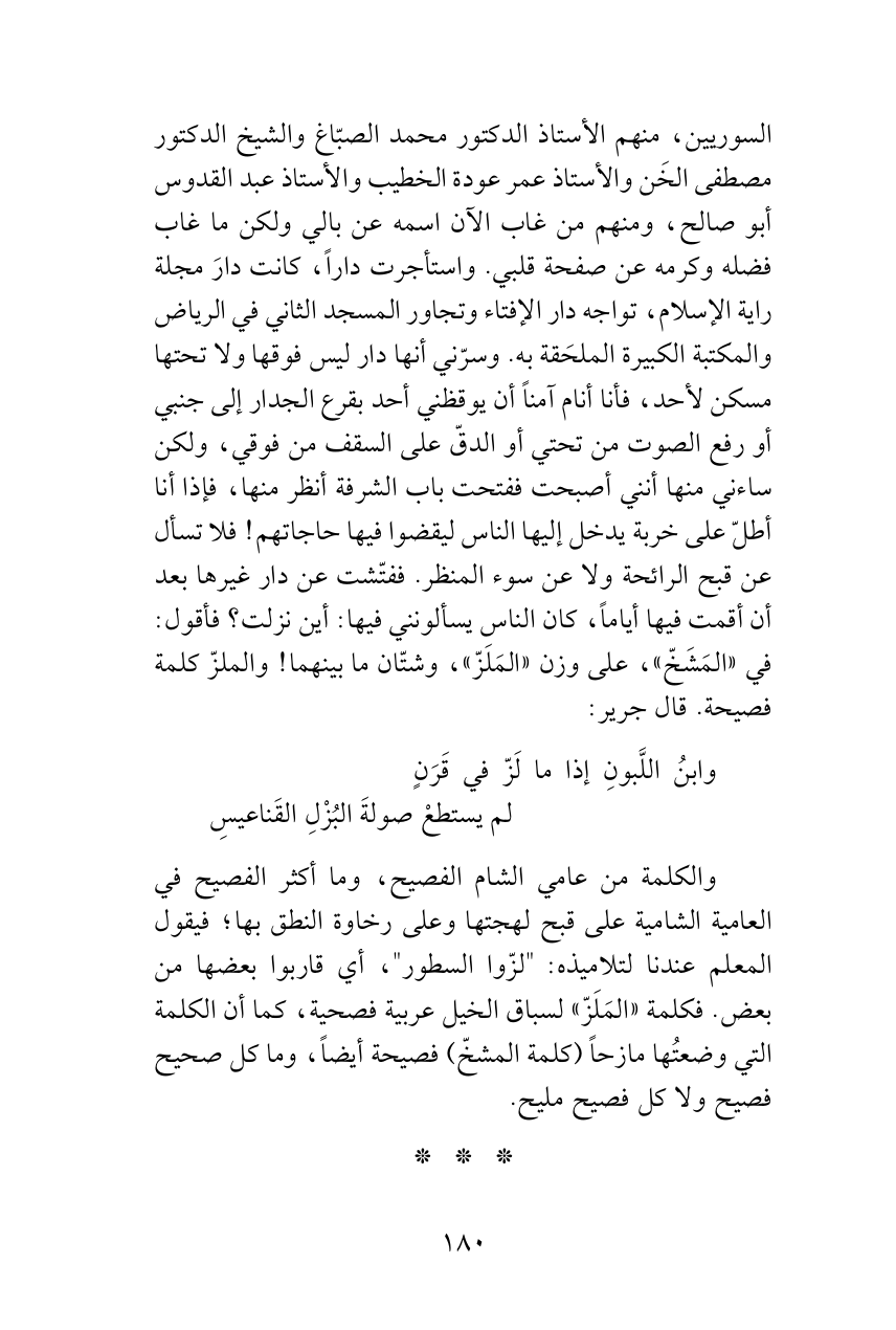 السوريين، منهم الأستاذ الدكتور محمد الصبّاغ والشيخ الدكتور مصطفى الخَن والأستاذ عمر عودة الخطيب والأستاذ عبدالقدوس أبو صالح، ومنهم من غاب الآن اسمه عن بالي ولكن ما غاب فضله وكرمه عن صفحة قلبي. واستأجرت داراً، كانت دارَ مجلة راية الإسلام، تواجه دار الإفتاء وتجاور المسجد الثاني في الرياض والمكتبة الكبيرة الملحَقة به. وسرّني أنها دار ليس فوقها ولا تحتها مسكن لأحد، فأنا أنام آمناً أن يوقظني أحد بقرع الجدار إلى جنبي أو رفع الصوت من تحتي أو الدقّ على السقف من فوقي، ولكن ساءني منها أنني أصبحت ففتحت باب الشرفة أنظر منها، فإذا أنا أطلّ على خربة يدخل إليها الناس ليقضوا فيها حاجاتهم! فلا تسأل عن قبح الرائحة ولا عن سوء المنظر. ففتّشت عن دار غيرها بعد أن أقمت فيها أياماً، كان الناس يسألونني فيها: أين نزلت؟ فأقول: في «المَشَخّ»، على وزن «المَلَزّ»، وشتّان ما بينهما! والملزّ كلمة فصيحة. قال جرير: