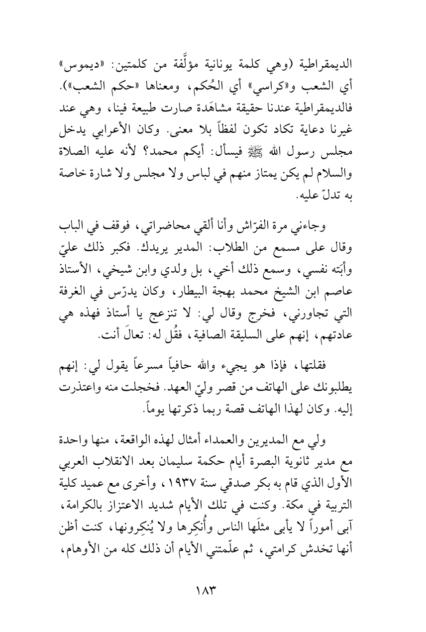 ولي مع المديرين والعمداء أمثال لهذه الواقعة، منها واحدة مع مدير ثانوية البصرة أيام حكمة سليمان بعد الانقلاب العربي الأول الذي قام به بكر صدقي سنة 1937، وأخرى مع عميد كلية التربية في مكة. وكنت في تلك الأيام شديد الاعتزاز بالكرامة، آبى أموراً لا يأبى مثلَها الناس وأُنكِرها ولا يُنكِرونها، كنت أظن أنها تخدش كرامتي، ثم علّمتني الأيام أن ذلك كله من الأوهام،