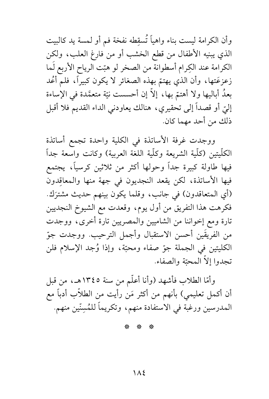 وأن الكرامة ليست بناء واهياً تُسقِطه نفخة فم أو لمسة يد كالبيت الذي يبنيه الأطفال من قطع الخشب أو من فارغ العلب، ولكن الكرامة عند الكِرام أسطوانة من الصخر لو هبّت الرياح الأربع لَما زعزعَتها، وأن الذي يهتمّ بهذه الصغائر لا يكون كبيراً، فلم أعُد بعدُ أباليها ولا أهتمّ بها، إلاّ إن أحسست نيّة متعمَّدة في الإساءة إليّ أو قصداً إلى تحقيري، هنالك يعاودني الداء القديم فلا أقبل ذلك من أحد مهما كان.
