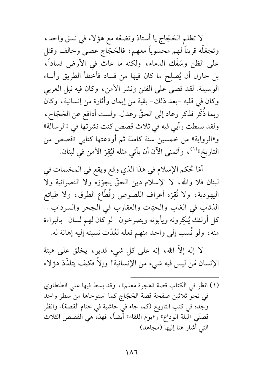 لا تظلم الحَجّاج ياأستاذ وتضعْه مع هؤلاء في نسق واحد، وتجعَلْه قريناً لهم محسوباً معهم؛ فالحَجّاج عصى وخالف وقتل على الظن وسَفَك الدماء، ولكنه ما عاث في الأرض فساداً، بل حاول أن يُصلِح ما كان فيها من فساد فأخطأ الطريق وأساء الوسيلة. لقد قضى على الفتن ونشر الأمن، وكان فيه نبل العربي وكان في قلبه -بعد ذلك- بقية من إيمان وأثارة من إنسانية، وكان ربما ذُكّر فذكر وعاد إلى الحقّ وعدل. ولست أدافع عن الحَجّاج، ولقد بسطت رأيي فيه في ثلاث قصص كنت نشرتها في «الرسالة» و «الرواية» من خمسين سنة كاملة ثم أودعتها كتابي «قصص من التاريخ» (¬1)، وأتمنى الآن أن يأتي مثله ليُقِرّ الأمن في لبنان.