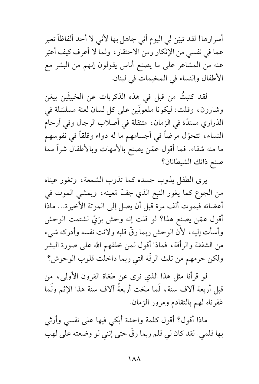 أسرارها! لقد تبيّن لي اليوم أني جاهل بها لأني لا أجد ألفاظاً تعبر عما في نفسي من الإنكار ومن الاحتقار، ولما لا أعرف كيف أعبّر عنه من المشاعر على ما يصنع أناس يقولون إنهم من البشر مع الأطفال والنساء في المخيمات في لبنان.