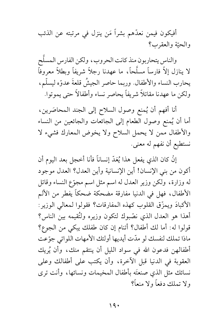 والناس يتحاربون منذ كانت الحروب، ولكن الفارس المسلَّح لا ينازل إلاّ فارساً مسلَّحاً، ما عهدنا رجلاً شريفاً وبطلاً معروفاً يحارب النساء والأطفال. وربما حاصر الجيشُ قلعةَ عدوّه ليسلّم، ولكن ما عهدنا مقاتلاً شريفاً يحاصر نساء وأطفالاً حتى يموتوا.