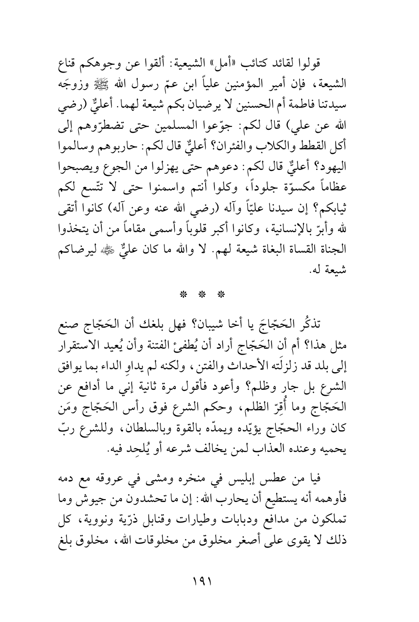 قولوا لقائد كتائب «أمل» الشيعية: ألقوا عن وجوهكم قناع الشيعة، فإن أمير المؤمنين علياً ابن عمّ رسول الله - صلى الله عليه وسلم - وزوجَه سيدتنا فاطمة أم الحسنين لا يرضيان بكم شيعة لهما. أعليٌّ (رضي الله عن علي) قال لكم: جوّعوا المسلمين حتى تضطرّوهم إلى أكل القطط والكلاب والفئران؟ أعليٌّ قال لكم: حاربوهم وسالموا اليهود؟ أعليٌّ قال لكم: دعوهم حتى يهزلوا من الجوع ويصبحوا عظاماً مكسوّة جلوداً، وكلوا أنتم واسمنوا حتى لا تتّسع لكم ثيابكم؟ إن سيدنا عليّاً وآله (رضي الله عنه وعن آله) كانوا أتقى لله وأبرّ بالإنسانية، وكانوا أكبر قلوباً وأسمى مقاماً من أن يتخذوا الجناة القساة البغاة شيعة لهم. لا والله ما كان عليٌّ - رضي الله عنه - ليرضاكم شيعة له.