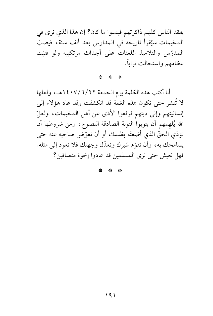 أنا أكتب هذه الكلمة يوم الجمعة 22/ 6/1407هـ، ولعلها لا تُنشر حتى تكون هذه الغمة قد انكشفت وقد عاد هؤلاء إلى إنسانيتهم وإلى دينهم فرفعوا الأذى عن أهل المخيمات، ولعلّ الله يُلهِمهم أن يتوبوا التوبة الصادقة النصوح، ومن شروطها أن تؤدّي الحقّ الذي أضعتَه بظلمك أو أن تعوّض صاحبه عنه حتى يسامحك به، وأن تقوّم سَيرك وتعدّل وجهتك فلا تعود إلى مثله. فهل نعيش حتى نرى المسلمين قد عادوا إخوة متصافين؟