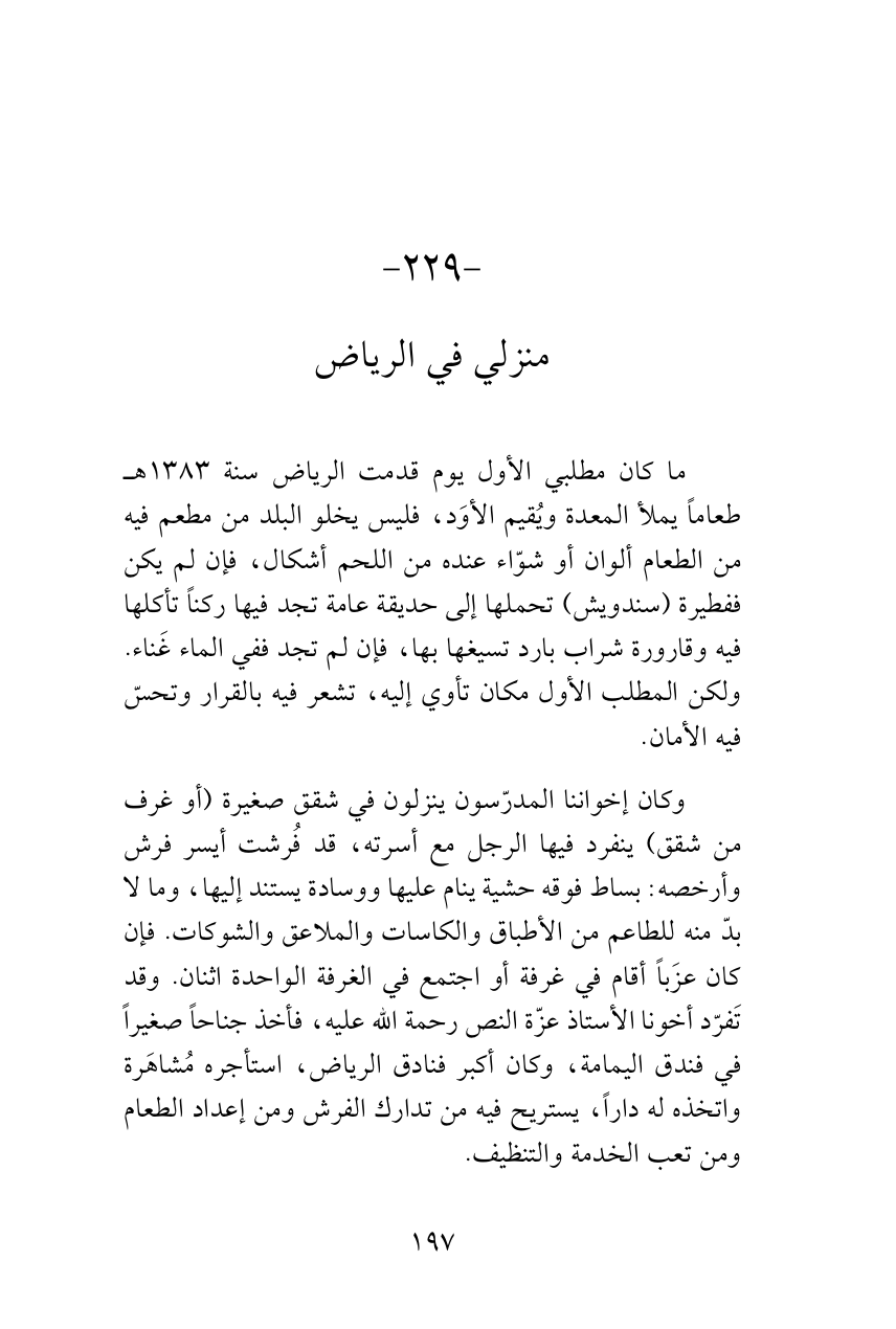 ما كان مطلبي الأول يوم قدمت الرياض سنة 1383هـ طعاماً يملأ المعدة ويُقيم الأوَد، فليس يخلو البلد من مطعم فيه من الطعام ألوان أو شوّاء عنده من اللحم أشكال، فإن لم يكن ففطيرة (سندويش) تحملها إلى حديقة عامة تجد فيها ركناً تأكلها فيه وقارورة شراب بارد تسيغها بها، فإن لم تجد ففي الماء غَناء. ولكن المطلب الأول مكان تأوي إليه، تشعر فيه بالقرار وتحسّ فيه الأمان.