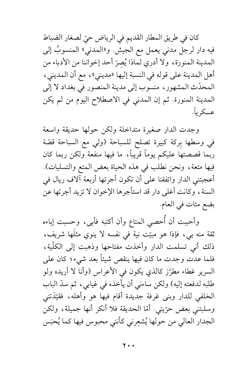 كان في طريق المطار القديم في الرياض حيّ لصغار الضباط فيه دار لرجل مدني يعمل مع الجيش. و «المدني» المنسوبُ إلى المدينة المنورة، ولا أدري لماذا يُصِرّ أحد إخواننا من الأدباء من أهل المدينة على قوله في النسبة إليها «مديني»، مع أن المديني، المحدّث المشهور، منسوب إلى مدينة المنصور في بغداد لا إلى المدينة المنورة. ثم إن المدني في الاصطلاح اليوم من لم يكن عسكرياً.