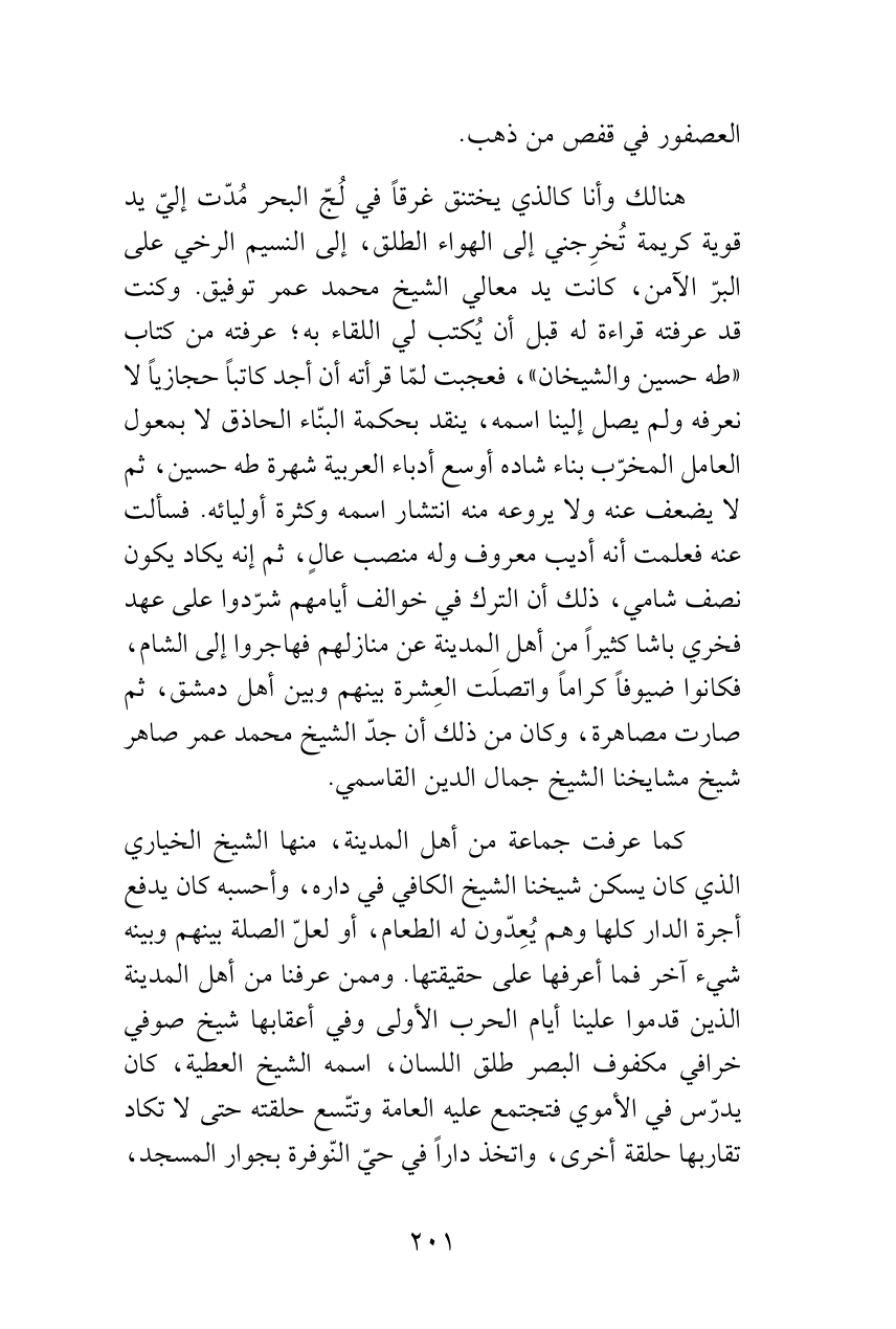 هنالك وأنا كالذي يختنق غرقاً في لُجّ البحر مُدّت إليّ يد قوية كريمة تُخرِجني إلى الهواء الطلق، إلى النسيم الرخي على البرّ الآمن، كانت يد معالي الشيخ محمد عمر توفيق. وكنت قد عرفته قراءة له قبل أن يُكتب لي اللقاء به؛ عرفته من كتاب «طه حسين والشيخان»، فعجبت لمّا قرأته أن أجد كاتباً حجازياً لا نعرفه ولم يصل إلينا اسمه، ينقد بحكمة البنّاء الحاذق لا بمعول العامل المخرّب بناء شاده أوسع أدباء العربية شهرة طه حسين، ثم لا يضعف عنه ولا يروعه منه انتشار اسمه وكثرة أوليائه. فسألت عنه فعلمت أنه أديب معروف وله منصب عالٍ، ثم إنه يكاد يكون نصف شامي، ذلك أن الترك في خوالف أيامهم شرّدوا على عهد فخري باشا كثيراً من أهل المدينة عن منازلهم فهاجروا إلى الشام، فكانوا ضيوفاً كراماً واتصلَت العِشرة بينهم وبين أهل دمشق، ثم صارت مصاهرة، وكان من ذلك أن جدّ الشيخ محمد عمر صاهر شيخ مشايخنا الشيخ جمال الدين القاسمي.