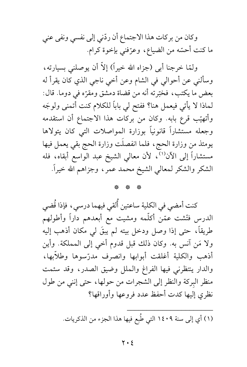 كنت أمضي في الكلية ساعتين أُلقي فيهما درسي، فإذا قُضي الدرس فتّشت عمّن أكلّمه ومشيت مع أبعدهم داراً وأطولهم طريقاً، حتى إذا وصل ودخل بيته لم يبقَ لي مكان أذهب إليه ولا مَن آنس به. وكان ذلك قبل قدوم أخي إلى المملكة. وأين أذهب والكلية أغلقت أبوابها وانصرف مدرّسوها وطلاّبها، والدار ينتظرني فيها الفراغ والملل وضيق الصدر، وقد سئمت منظر البِركة والنظر إلى الشجرات من حولها، حتى إنني من طول نظري إليها كدت أحفظ عدد فروعها وأوراقها؟
