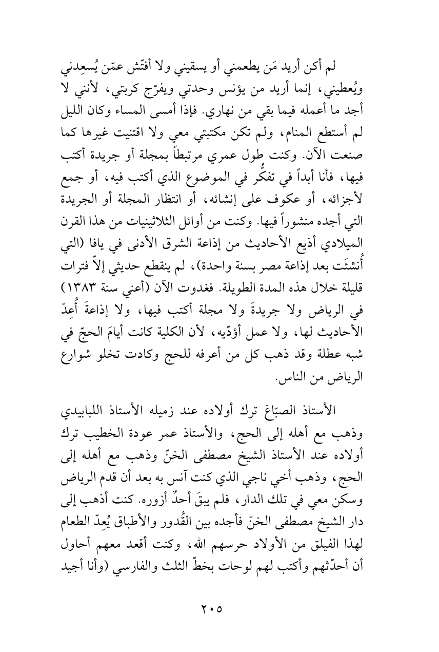 الأستاذ الصبّاغ ترك أولاده عند زميله الأستاذ اللبابيدي وذهب مع أهله إلى الحج، والأستاذ عمر عودة الخطيب ترك أولاده عند الأستاذ الشيخ مصطفى الخنّ وذهب مع أهله إلى الحج، وذهب أخي ناجي الذي كنت آنس به بعد أن قدم الرياض وسكن معي في تلك الدار، فلم يبقَ أحدٌ أزوره. كنت أذهب إلى دار الشيخ مصطفى الخنّ فأجده بين القُدور والأطباق يُعِدّ الطعام لهذا الفيلق من الأولاد حرسهم الله، وكنت أقعد معهم أحاول أن أحدّثهم وأكتب لهم لوحات بخطّ الثلث والفارسي (وأنا أجيد