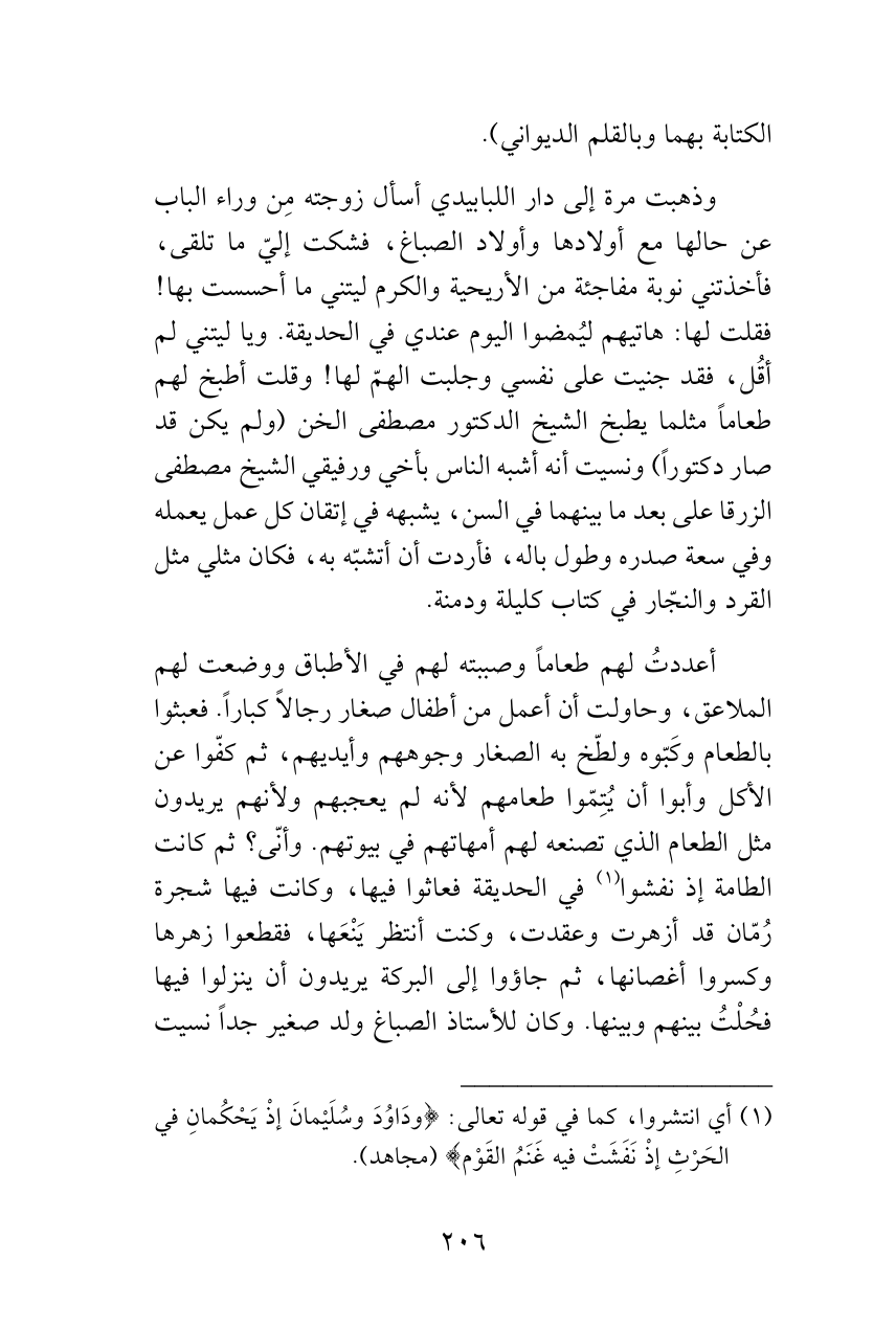 وذهبت مرة إلى دار اللبابيدي أسأل زوجته مِن وراء الباب عن حالها مع أولادها وأولاد الصباغ، فشكت إليّ ما تلقى، فأخذتني نوبة مفاجئة من الأريحية والكرم ليتني ما أحسست بها! فقلت لها: هاتيهم ليُمضوا اليوم عندي في الحديقة. ويا ليتني لم أقُل، فقد جنيت على نفسي وجلبت الهمّ لها! وقلت أطبخ لهم طعاماً مثلما يطبخ الشيخ الدكتور مصطفى الخن (ولم يكن قد صار دكتوراً) ونسيت أنه أشبه الناس بأخي ورفيقي الشيخ مصطفى الزرقا على بعد ما بينهما في السن، يشبهه في إتقان كل عمل يعمله وفي سعة صدره وطول باله، فأردت أن أتشبّه به، فكان مثلي مثل القرد والنجّار في كتاب كليلة ودمنة.