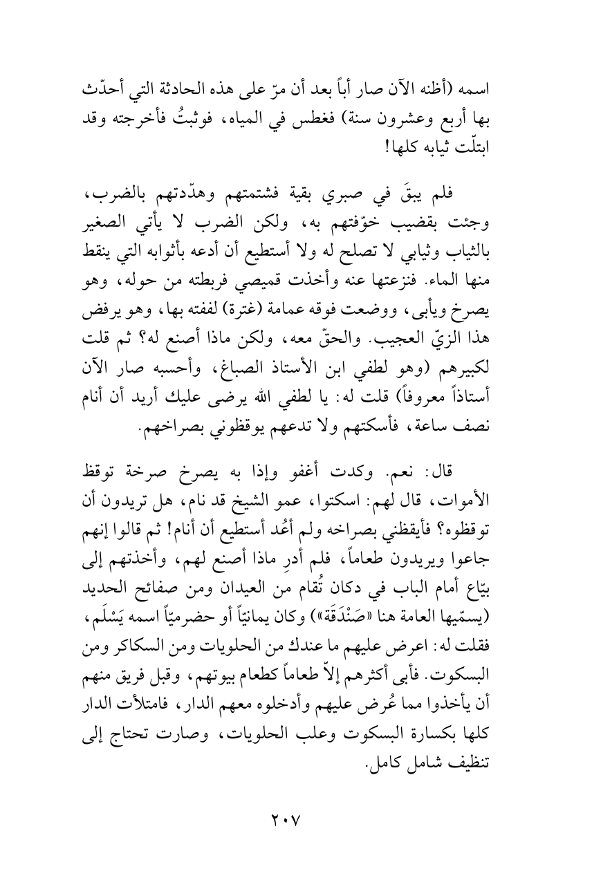 فلم يبقَ في صبري بقية فشتمتهم وهدّدتهم بالضرب، وجئت بقضيب خوّفتهم به، ولكن الضرب لا يأتي الصغير بالثياب وثيابي لا تصلح له ولا أستطيع أن أدعه بأثوابه التي ينقط منها الماء. فنزعتها عنه وأخذت قميصي فربطته من حوله، وهو يصرخ ويأبى، ووضعت فوقه عمامة (غترة) لففته بها، وهو يرفض هذا الزيّ العجيب. والحقّ معه، ولكن ماذا أصنع له؟ ثم قلت لكبيرهم (وهو لطفي ابن الأستاذ الصباغ، وأحسبه صار الآن أستاذاً معروفاً) قلت له: يالطفي الله يرضى عليك أريد أن أنام نصف ساعة، فأسكتهم ولا تدعهم يوقظوني بصراخهم.