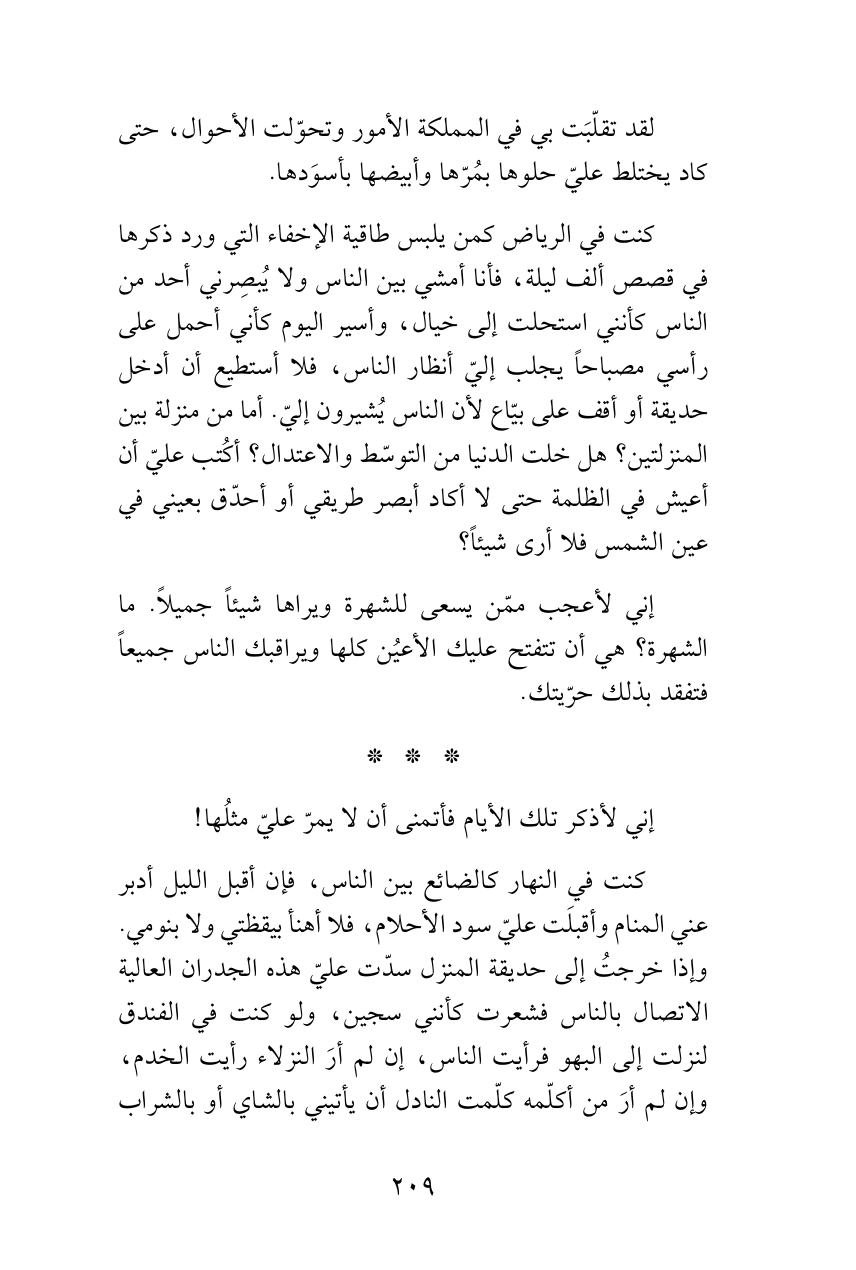 كنت في الرياض كمن يلبس طاقية الإخفاء التي ورد ذكرها في قصص ألف ليلة، فأنا أمشي بين الناس ولا يُبصِرني أحد من الناس كأنني استحلت إلى خيال، وأسير اليوم كأني أحمل على رأسي مصباحاً يجلب إليّ أنظار الناس، فلا أستطيع أن أدخل حديقة أو أقف على بيّاع لأن الناس يُشيرون إليّ. أما من منزلة بين المنزلتين؟ هل خلت الدنيا من التوسّط والاعتدال؟ أكُتب عليّ أن أعيش في الظلمة حتى لا أكاد أبصر طريقي أو أحدّق بعيني في عين الشمس فلا أرى شيئاً؟