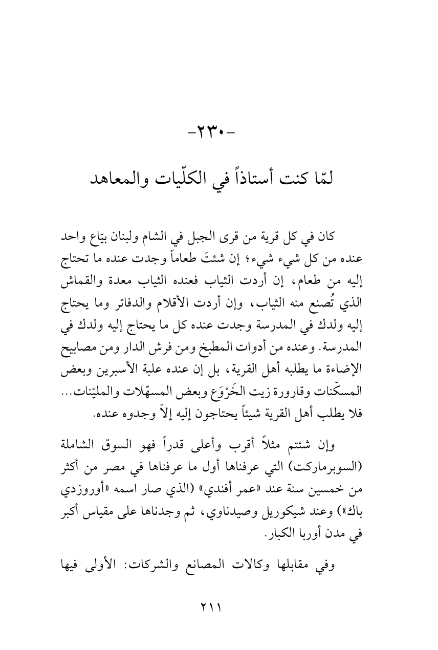 وإن شئتم مثلاً أقرب وأعلى قدراً فهو السوق الشاملة (السوبرماركت) التي عرفناها أول ما عرفناها في مصر من أكثر من خمسين سنة عند «عمر أفندي» (الذي صار اسمه «أوروزدي باك») وعند شيكوريل وصيدناوي، ثم وجدناها على مقياس أكبر في مدن أوربا الكبار.