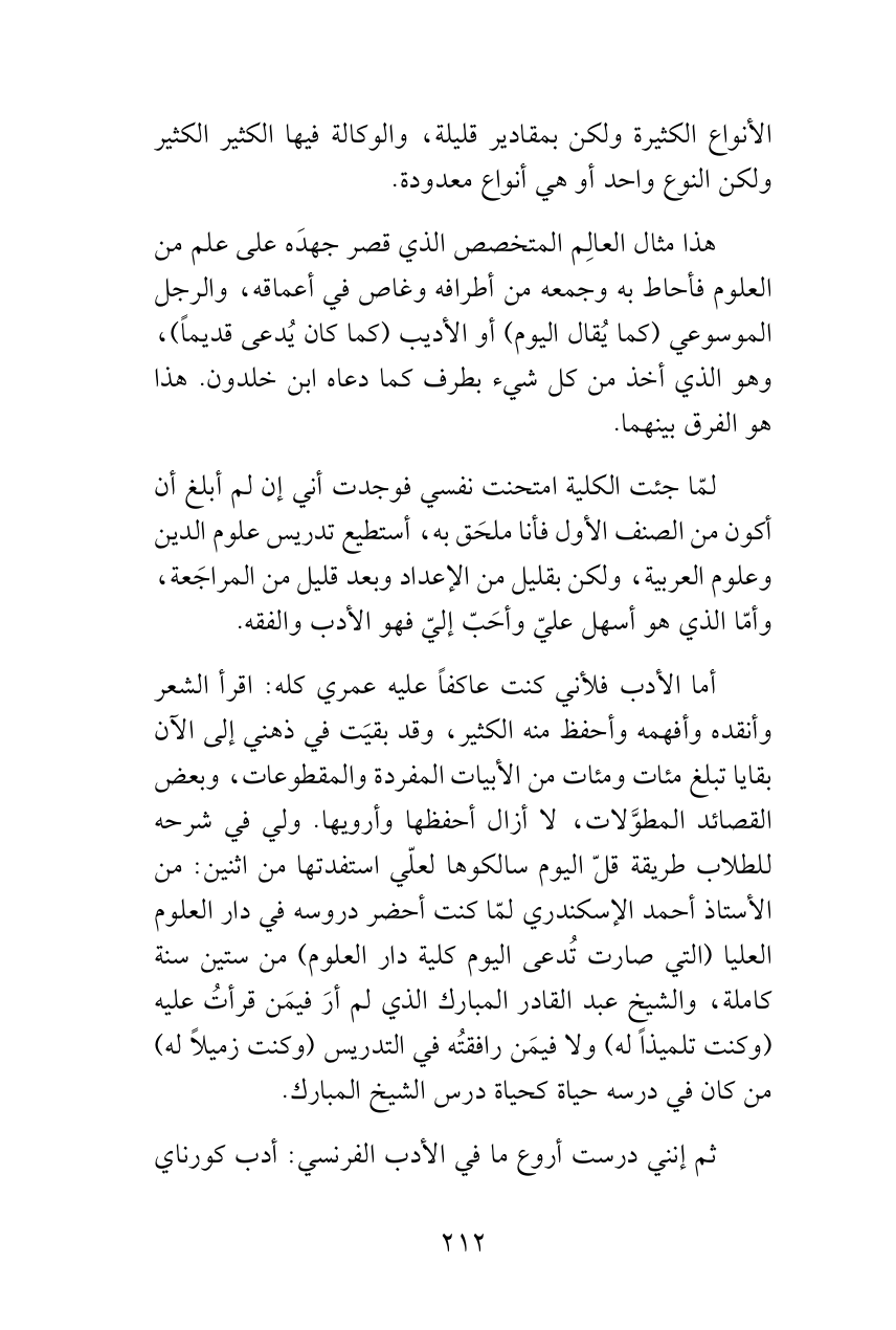 لمّا جئت الكلية امتحنت نفسي فوجدت أني إن لم أبلغ أن أكون من الصنف الأول فأنا ملحَق به، أستطيع تدريس علوم الدين وعلوم العربية، ولكن بقليل من الإعداد وبعد قليل من المراجَعة، وأمّا الذي هو أسهل عليّ وأحَبّ إليّ فهو الأدب والفقه.