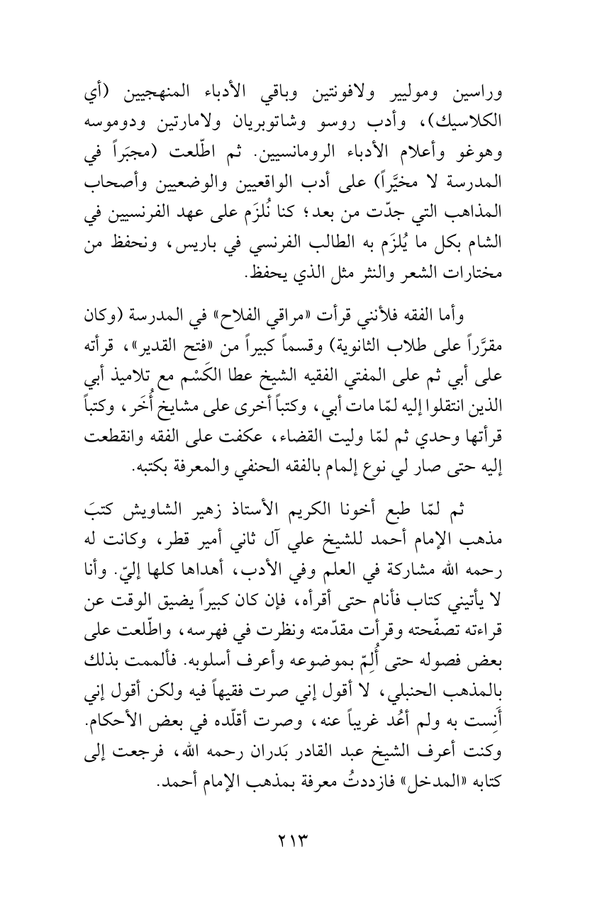 ثم لمّا طبع أخونا الكريم الأستاذ زهير الشاويش كتبَ مذهب الإمام أحمد للشيخ علي آل ثاني أمير قطر، وكانت له رحمه الله مشاركة في العلم وفي الأدب، أهداها كلها إليّ. وأنا لا يأتيني كتاب فأنام حتى أقرأه، فإن كان كبيراً يضيق الوقت عن قراءته تصفّحته وقرأت مقدّمته ونظرت في فهرسه، واطّلعت على بعض فصوله حتى أُلِمّ بموضوعه وأعرف أسلوبه. فألممت بذلك بالمذهب الحنبلي، لا أقول إني صرت فقيهاً فيه ولكن أقول إني أَنِست به ولم أعُد غريباً عنه، وصرت أقلّده في بعض الأحكام. وكنت أعرف الشيخ عبد القادر بَدران رحمه الله، فرجعت إلى كتابه «المدخل» فازددتُ معرفة بمذهب الإمام أحمد.