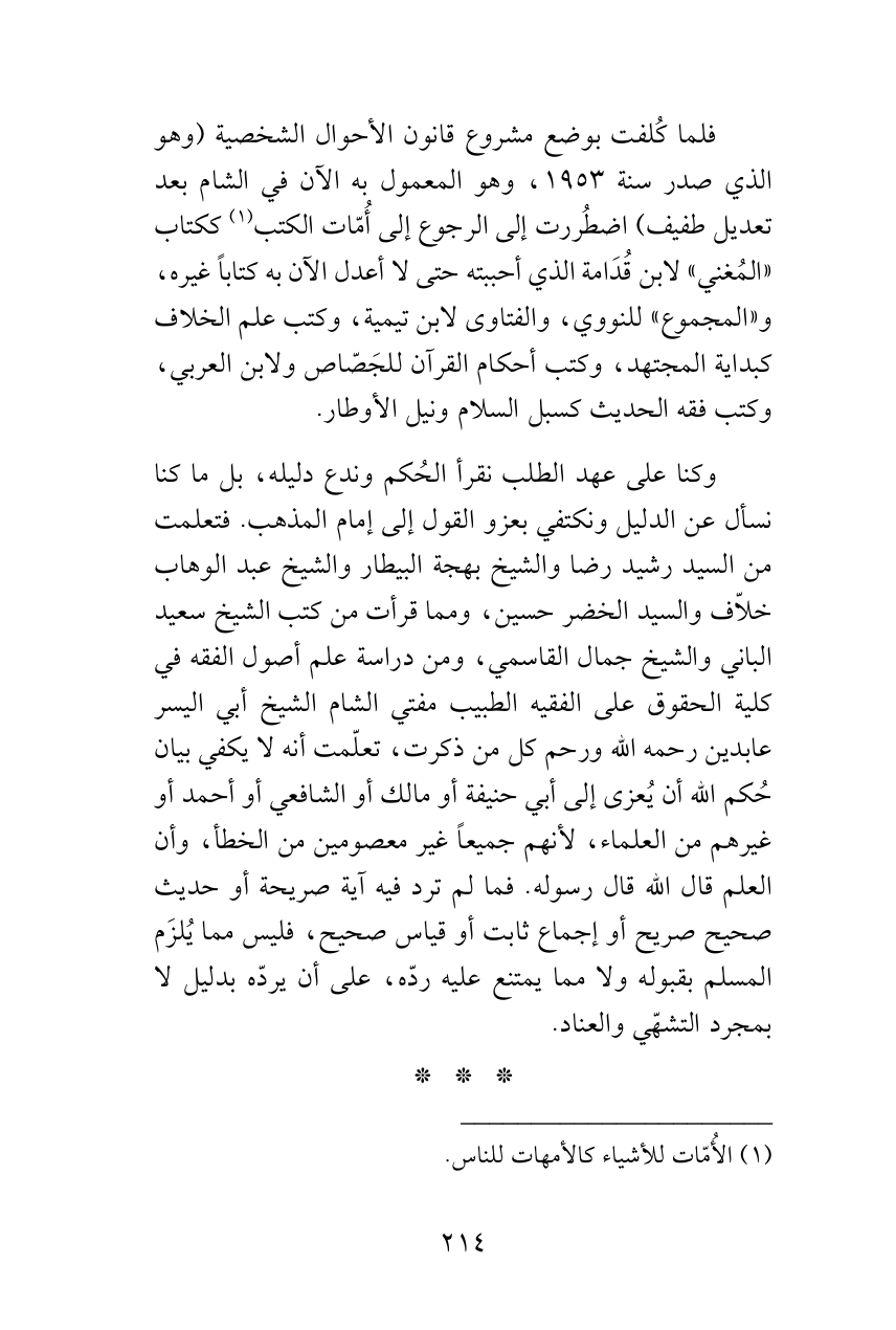 فلما كُلفت بوضع مشروع قانون الأحوال الشخصية (وهو الذي صدر سنة 1953، وهو المعمول به الآن في الشام بعد تعديل طفيف) اضطُررت إلى الرجوع إلى أُمّات الكتب (¬1) ككتاب «المُغني» لابن قُدَامة الذي أحببته حتى لا أعدل الآن به كتاباً غيره، و «المجموع» للنووي، والفتاوى لابن تيمية، وكتب علم الخلاف كبداية المجتهد، وكتب أحكام القرآن للجَصّاص ولابن العربي، وكتب فقه الحديث كسبل السلام ونيل الأوطار.