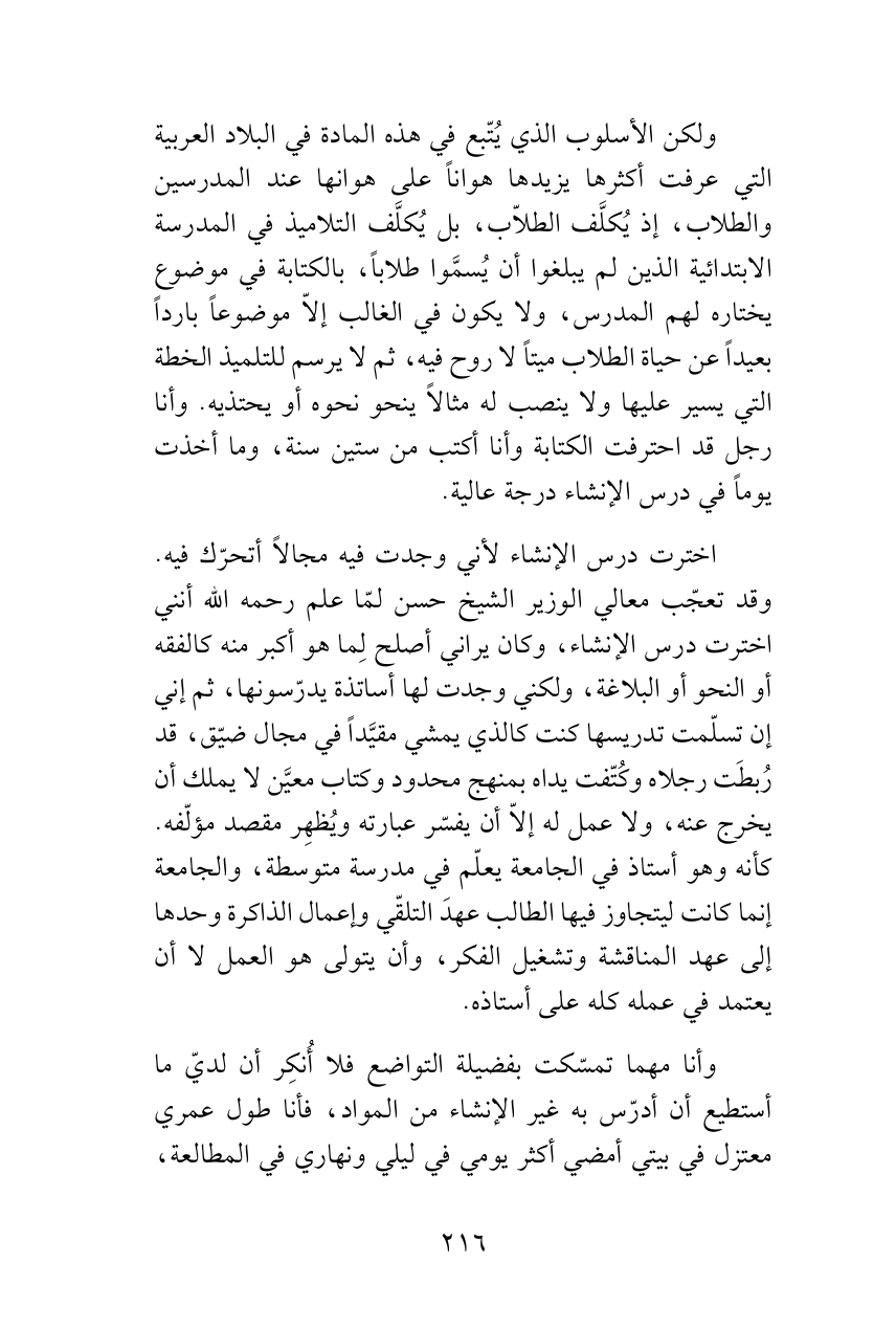 اخترت درس الإنشاء لأني وجدت فيه مجالاً أتحرّك فيه. وقد تعجّب معالي الوزير الشيخ حسن لمّا علم رحمه الله أنني اخترت درس الإنشاء، وكان يراني أصلح لِما هو أكبر منه كالفقه أو النحو أو البلاغة، ولكني وجدت لها أساتذة يدرّسونها، ثم إني إن تسلّمت تدريسها كنت كالذي يمشي مقيَّداً في مجال ضيّق، قد رُبطَت رجلاه وكُتّفت يداه بمنهج محدود وكتاب معيَّن لا يملك أن يخرج عنه، ولا عمل له إلاّ أن يفسّر عبارته ويُظهِر مقصد مؤلّفه. كأنه وهو أستاذ في الجامعة يعلّم في مدرسة متوسطة، والجامعة إنما كانت ليتجاوز فيها الطالب عهدَ التلقّي وإعمال الذاكرة وحدها إلى عهد المناقشة وتشغيل الفكر، وأن يتولى هو العمل لا أن يعتمد في عمله كله على أستاذه.