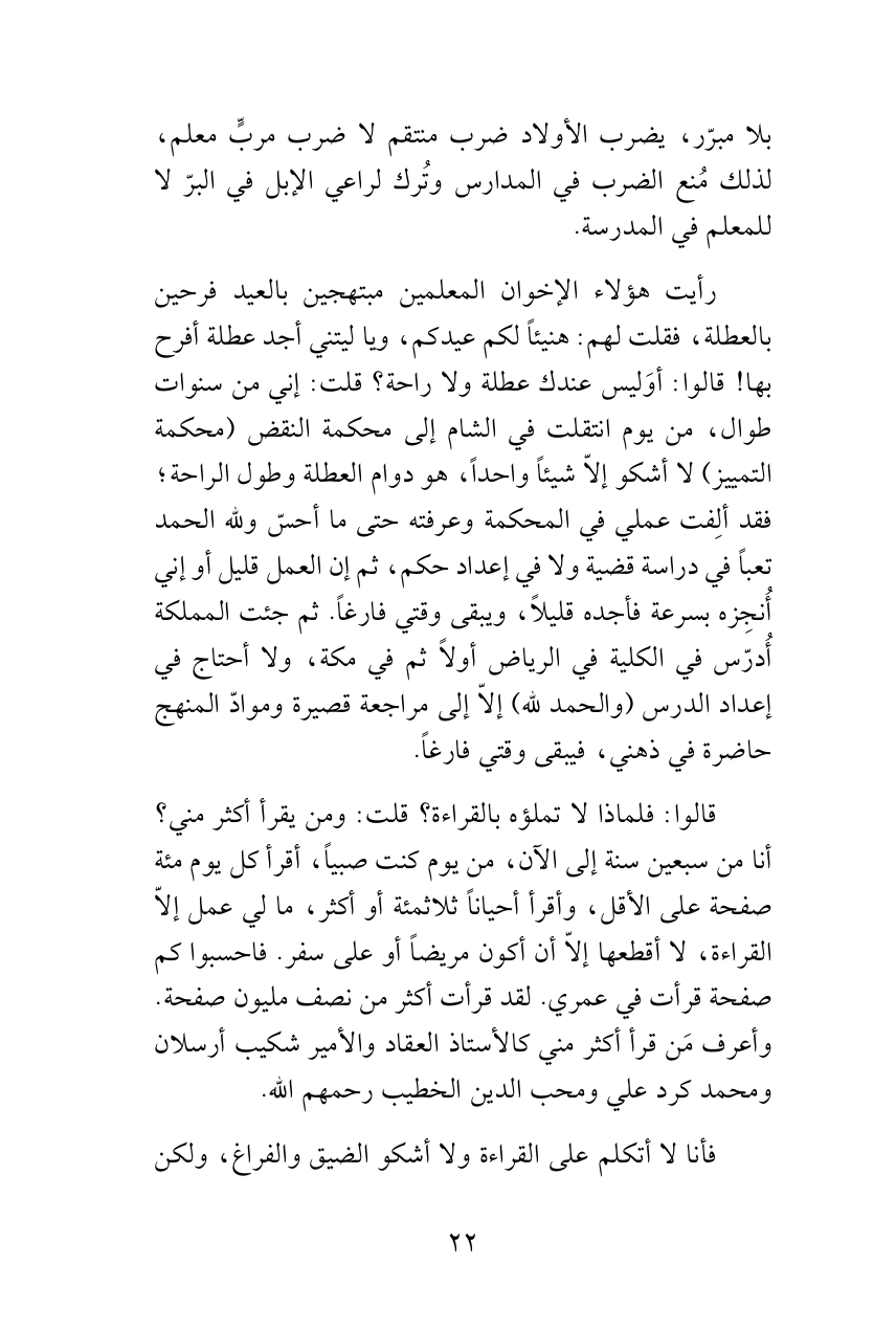 رأيت هؤلاء الإخوان المعلمين مبتهجين بالعيد فرحين بالعطلة، فقلت لهم: هنيئاً لكم عيدكم، ويا ليتني أجد عطلة أفرح بها! قالوا: أوَليس عندك عطلة ولا راحة؟ قلت: إني من سنوات طوال، من يوم انتقلت في الشام إلى محكمة النقض (محكمة التمييز) لا أشكو إلاّ شيئاً واحداً، هو دوام العطلة وطول الراحة؛ فقد ألِفت عملي في المحكمة وعرفته حتى ما أحسّ ولله الحمد تعباً في دراسة قضية ولا في إعداد حكم، ثم إن العمل قليل أو إني أُنجِزه بسرعة فأجده قليلاً، ويبقى وقتي فارغاً. ثم جئت المملكة أُدرّس في الكلية في الرياض أولاً ثم في مكة، ولا أحتاج في إعداد الدرس (والحمد لله) إلاّ إلى مراجعة قصيرة وموادّ المنهج حاضرة في ذهني، فيبقى وقتي فارغاً.