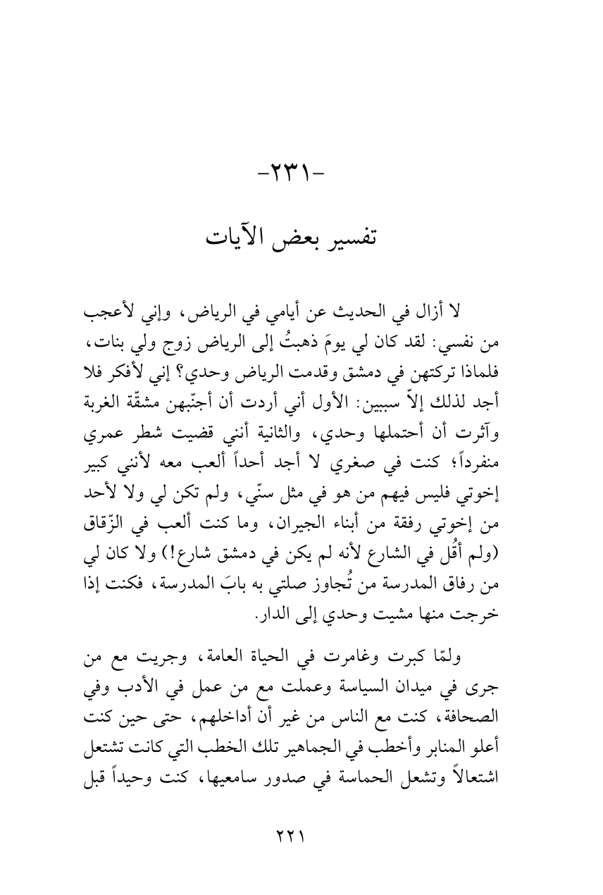 لا أزال في الحديث عن أيامي في الرياض، وإني لأعجب من نفسي: لقد كان لي يومَ ذهبتُ إلى الرياض زوج ولي بنات، فلماذا تركتهن في دمشق وقدمت الرياض وحدي؟ إني لأفكر فلا أجد لذلك إلاّ سببين: الأول أني أردت أن أجنّبهن مشقّة الغربة وآثرت أن أحتملها وحدي، والثانية أنني قضيت شطر عمري منفرداً؛ كنت في صغري لا أجد أحداً ألعب معه لأنني كبير إخوتي فليس فيهم من هو في مثل سنّي، ولم تكن لي ولا لأحد من إخوتي رفقة من أبناء الجيران، وما كنت ألعب في الزّقاق (ولم أقُل في الشارع لأنه لم يكن في دمشق شارع!) ولا كان لي من رفاق المدرسة من تُجاوز صلتي به بابَ المدرسة، فكنت إذا خرجت منها مشيت وحدي إلى الدار.