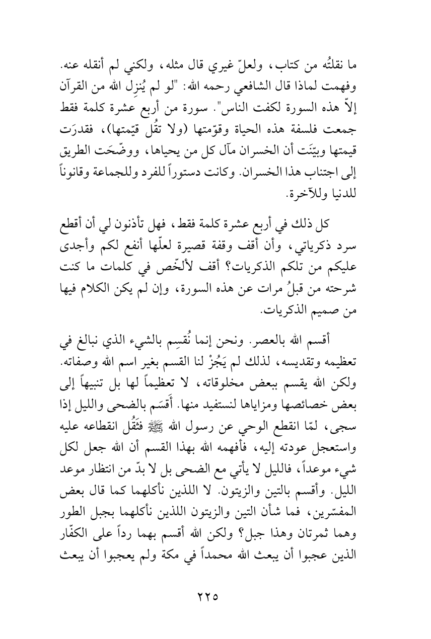 ما نقلتُه من كتاب، ولعلّ غيري قال مثله، ولكني لم أنقله عنه. وفهمت لماذا قال الشافعي رحمه الله: "لو لم يُنزِل الله من القرآن إلاّ هذه السورة لكفت الناس". سورة من أربع عشرة كلمة فقط جمعت فلسفة هذه الحياة وقوّمتها (ولا تقُل قيّمتها)، فقدرَت قيمتها وبيّنَت أن الخسران مآل كل من يحياها، ووضّحَت الطريق إلى اجتناب هذا الخسران. وكانت دستوراً للفرد وللجماعة وقانوناً للدنيا وللآخرة.