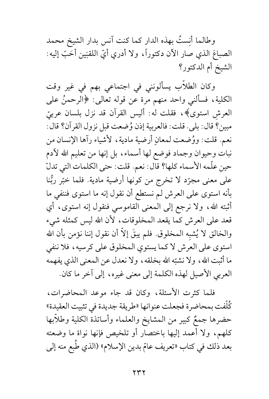 وكان الطلاّب يسألونني في اجتماعي بهم في غير وقت الكلية، فسألني واحد منهم مرة عن قوله تعالى: {الرحمنُ على العرشِ استوى}، فقلت له: أليس القرآن قد نزل بلسان عربيّ مبين؟ قال: بلى. قلت: فالعربية إذن وُضعت قبل نزول القرآن؟ قال: نعم. قلت: ووُضعت لمعانٍ أرضية مادية، لأشياء رآها الإنسان من نبات وحيوان وجماد فوضع لها أسماء، بل إنها من تعليم الله لآدم حين علّمه الأسماء كلها؟ قال: نعم. قلت: حتى الكلمات التي تدلّ على معنى مجرّد لا تخرج من كونها أرضية مادية. فلما خبّر ربُّنا بأنه استوى على العرش لم نستطع أن نقول إنه ما استوى فننفي ما أثبته الله، ولا نرجع إلى المعنى القاموسي فنقول إنه استوى، أي قعد على العرش كما يقعد المخلوقات، لأن الله ليس كمثله شيء والخالق لا يُشبِه المخلوق. فلم يبقَ إلاّ أن نقول إننا نؤمن بأن الله استوى على العرش لا كما يستوي المخلوق على كرسيه، فلا ننفي ما أثبت الله، ولا نشبّه الله بخلقه، ولا نعدل عن المعنى الذي يفهمه العربي الأصيل لهذه الكلمة إلى معنى غيره، إلى آخر ما كان.