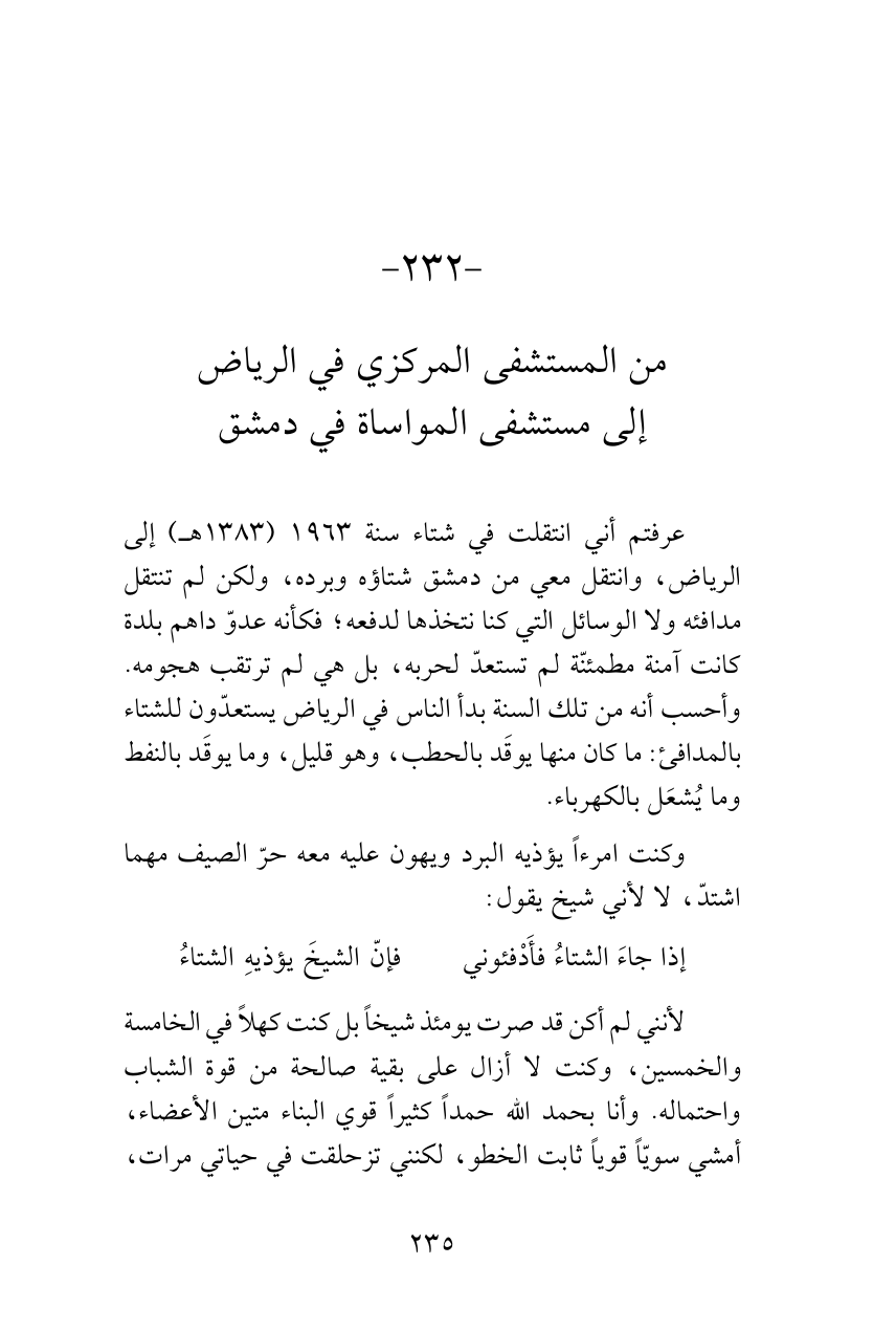 عرفتم أني انتقلت في شتاء سنة 1963 (1383هـ) إلى الرياض، وانتقل معي من دمشق شتاؤه وبرده، ولكن لم تنتقل مدافئه ولا الوسائل التي كنا نتخذها لدفعه؛ فكأنه عدوّ داهم بلدة كانت آمنة مطمئنّة لم تستعدّ لحربه، بل هي لم ترتقب هجومه. وأحسب أنه من تلك السنة بدأ الناس في الرياض يستعدّون للشتاء بالمدافئ: ما كان منها يوقَد بالحطب، وهو قليل، وما يوقَد بالنفط وما يُشعَل بالكهرباء.