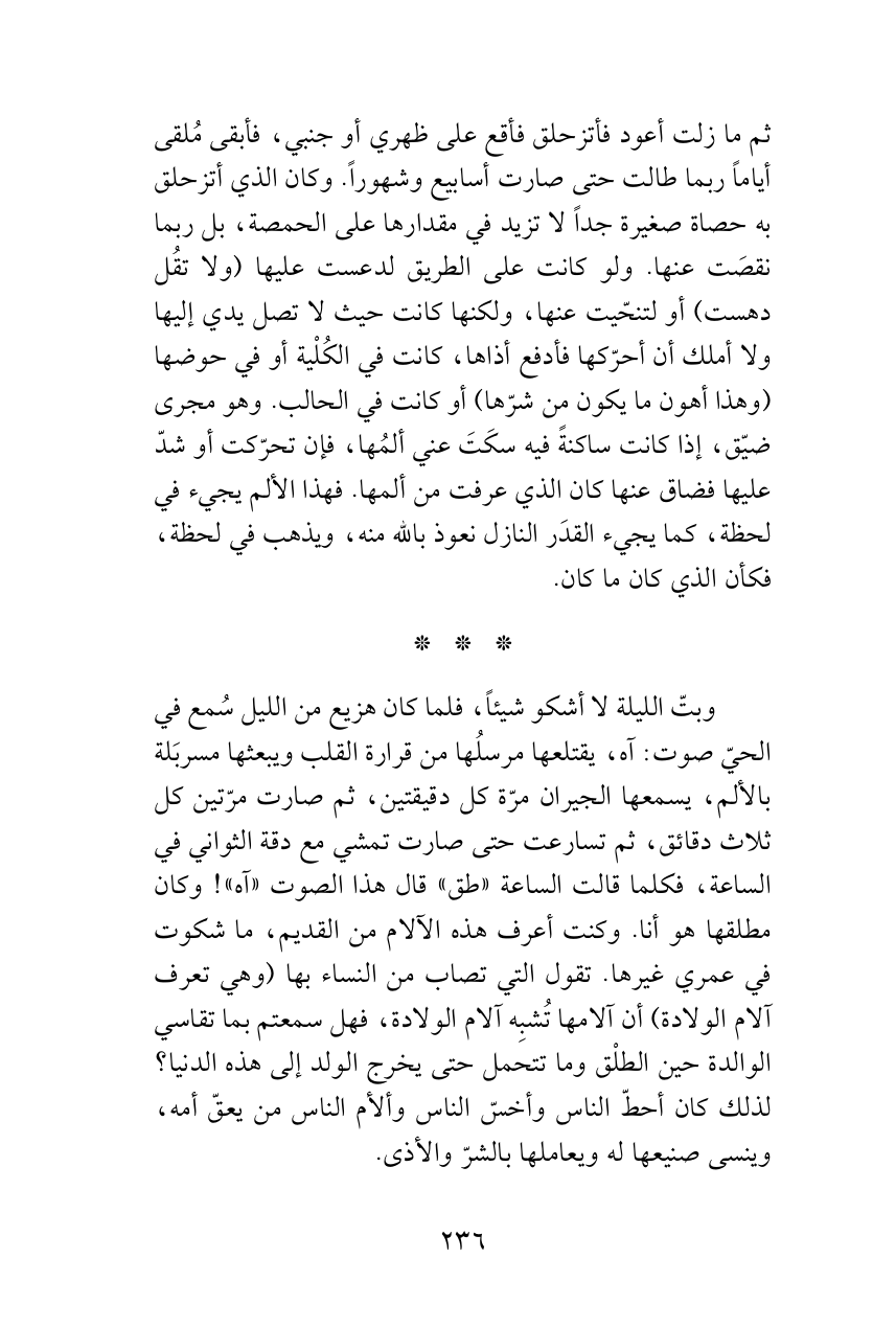 ثم ما زلت أعود فأتزحلق فأقع على ظهري أو جنبي، فأبقى مُلقى أياماً ربما طالت حتى صارت أسابيع وشهوراً. وكان الذي أتزحلق به حصاة صغيرة جداً لا تزيد في مقدارها على الحمصة، بل ربما نقصَت عنها. ولو كانت على الطريق لدعست عليها (ولا تقُل دهست) أو لتنحّيت عنها، ولكنها كانت حيث لا تصل يدي إليها ولا أملك أن أحرّكها فأدفع أذاها، كانت في الكُلْية أو في حوضها (وهذا أهون ما يكون من شرّها) أو كانت في الحالب. وهو مجرى ضيّق، إذا كانت ساكنةً فيه سكَتَ عني ألمُها، فإن تحرّكت أو شدّ عليها فضاق عنها كان الذي عرفت من ألمها. فهذا الألم يجيء في لحظة، كما يجيء القدَر النازل نعوذ بالله منه، ويذهب في لحظة، فكأن الذي كان ما كان.