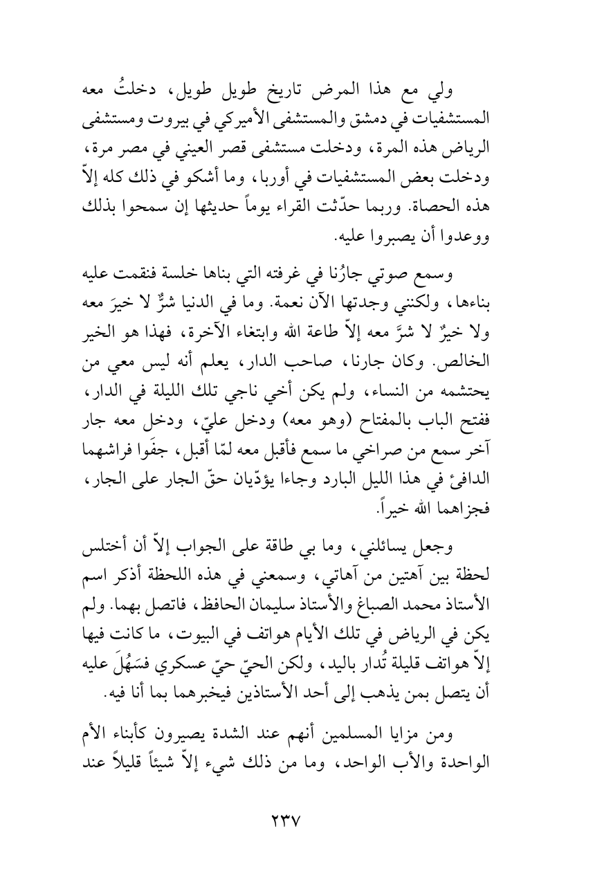 وسمع صوتي جارُنا في غرفته التي بناها خلسة فنقمت عليه بناءها، ولكنني وجدتها الآن نعمة. وما في الدنيا شرٌّ لا خيرَ معه ولا خيرٌ لا شرَّ معه إلاّ طاعة الله وابتغاء الآخرة، فهذا هو الخير الخالص. وكان جارنا، صاحب الدار، يعلم أنه ليس معي من يحتشمه من النساء، ولم يكن أخي ناجي تلك الليلة في الدار، ففتح الباب بالمفتاح (وهو معه) ودخل عليّ، ودخل معه جار آخر سمع من صراخي ما سمع فأقبل معه لمّا أقبل، جفَوا فراشهما الدافئ في هذا الليل البارد وجاءا يؤدّيان حقّ الجار على الجار، فجزاهما الله خيراً.