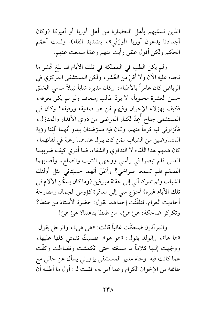 ولم يكن الطب في المملكة في تلك الأيام قد بلغ عُشر ما نجده عليه الآن ولا أقلّ من العُشر، ولكن المستشفى المركزي في الرياض كان عامراً بالأطباء، وكان مديره شاباً نبيلاً سامي الخلق حسن العشرة محبوباً، لا يردّ طالب إسعاف ولو لم يكن يعرفه، فكيف بهؤلاء الإخوان وفيهم مَن هو صديقه ورفيقه؟ وكان في المستشفى جناح أُعِدّ لكبار المرضى من ذوي الأقدار والمنازل، فأنزلوني فيه كرماً منهم. وكان فيه ممرّضتان يبدو أنهما ألِفتا رؤية المتمارضين من الشباب ممّن كان ينزل عندهما رغبة في لقائهما، كان همهم هذا اللقاء لا التداوي والشفاء. فما أدري كيف ضربهما العمى فلم تبصرا في رأسي ووجهي الشيب والصلع، وأصابهما الصمَم فلم تسمعا صراخي؟ وأظنّ أنهما حسبَتاني مثل أولئك الشباب ولم تدركا أني إلى حقنة مورفين (وما كان يسكّن الآلام في تلك الأيام غيره) أحوَج مني إلى معاقرة كؤوس الجمال ومطارحة أحاديث الغرام. فتلفّتَت إحداهما تقول: حضرة الأستاذ من طنطا؟ وتكركر ضاحكة: هئ هئ، من طنطا بتاعتنا؟ هئ هئ!