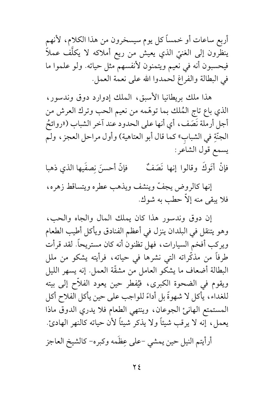إن دوق وندسور هذا كان يملك المال والجاه والحب، وهو يتنقل في البلدان ينزل في أعظم الفنادق ويأكل أطيب الطعام ويركب أفخم السيارات، فهل تظنون أنه كان مستريحاً. لقد قرأت طرفاً من مذكّراته التي نشرها في حياته، فرأيته يشكو من ملل البطالة أضعاف ما يشكو العامل من مشقّة العمل. إنه يسهر الليل ويقوم في الضحوة الكبرى، فيُفطر حين يعود الفلاّح إلى بيته للغداء، يأكل لا شهوةً بل أداءً للواجب على حين يأكل الفلاح أكل المستمتع الهانئ الجوعان، وينتهي الطعام فلا يدري الدوق ماذا يعمل، إنه لا يرقب شيئاً ولا يذكر شيئاً لأن حياته كالنهر الهادئ.